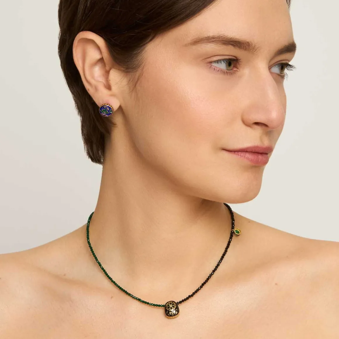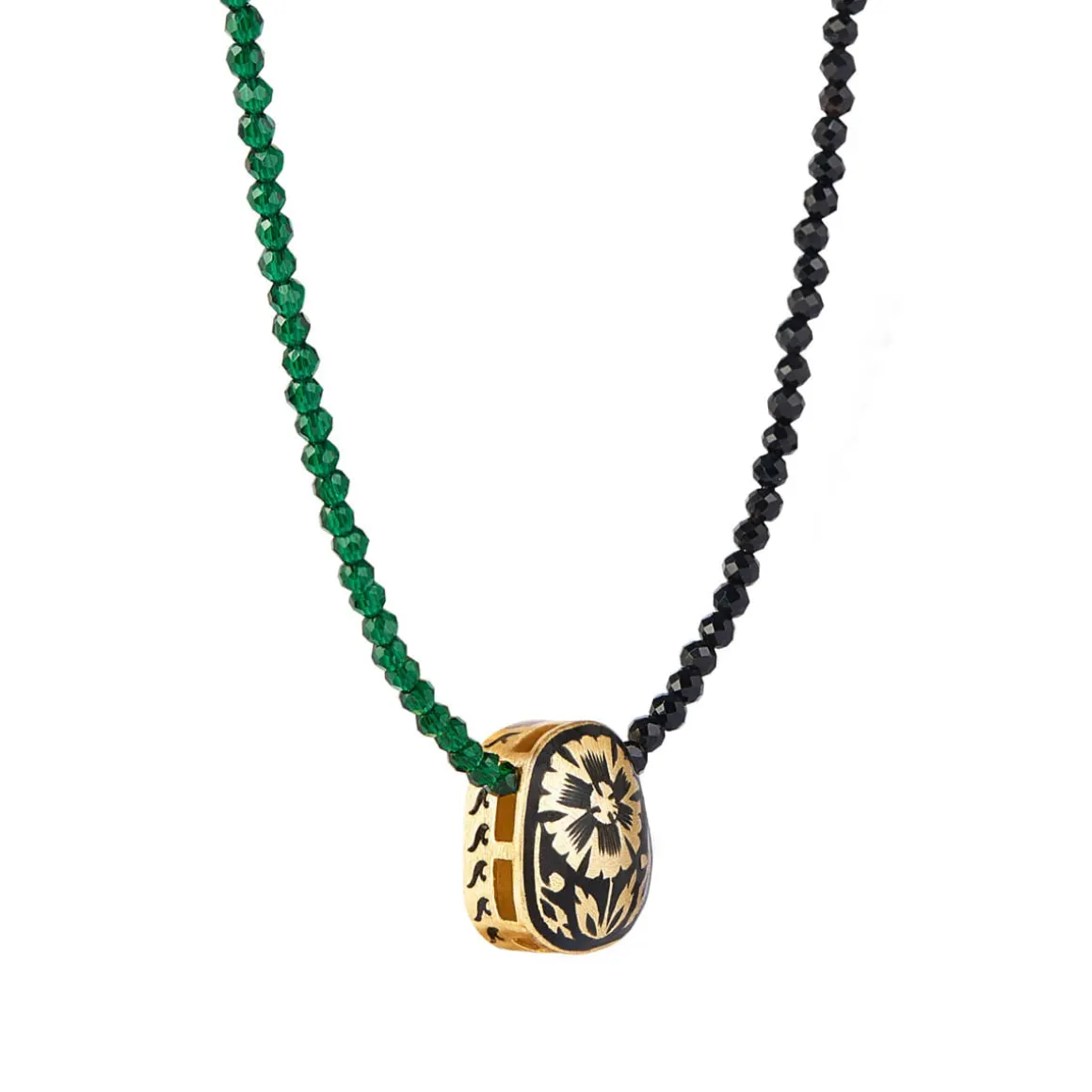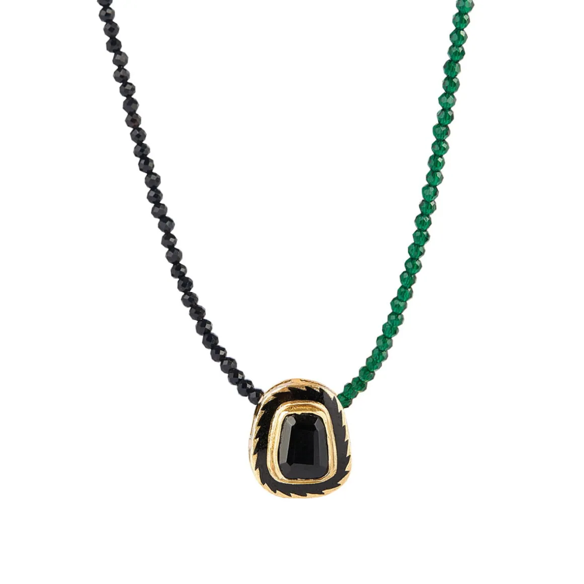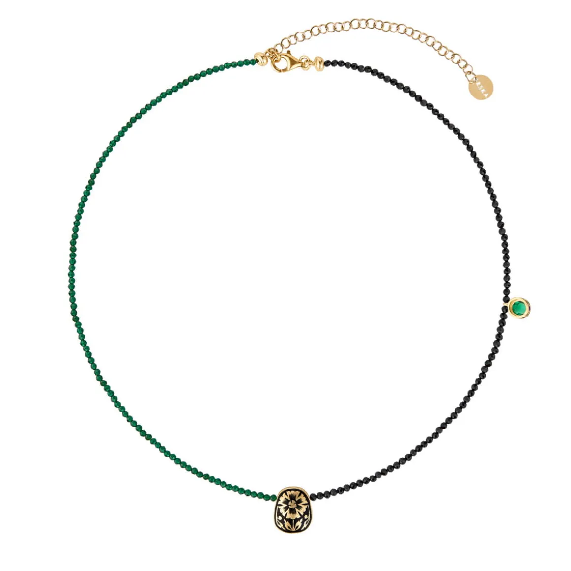Krótki naszyjnik powstał w pracowni ORSKA z pozłacanego srebra i kolorowych kamieni. W połowie naszyjnik wykonany jest z cyrkonii w kolorze ciemnej zieleni, w połowie z fasetowanych czarnych onyksów. Kamienie łączy po środku ozdobna zawieszka zdobiona z każdej strony wykonana w Radżastanie przez zaprzyjaźnionych rzemieślników, których Anna Orska poznała w trakcie projektowej podróży do Indii. Na jednej z nich centrycznie umieszczono czarne kundan glass, czyli tradycyjne indyjskie szkło, które zostało otoczone pozłacanym srebrem oraz zdobieniami z czarnej emalii. Na odwrocie zawieszki namalowany został czarno-złoty ornament w formie kwiatu nagietka. Naszyjnik jest asymetryczny – na jego boku pomiędzy onyksami przewleczono dodatkową zawieszkę z centralnie osadzonym zielonym kundan glass, którego oprawa została pokryta misternymi zdobieniami z zielono-niebieskiej emalii. Asymetria nadaje naszyjnikowi artystycznego, nieszablonowego charakteru. To biżuteria dla tych, którzy nie boją się wyróżniać.