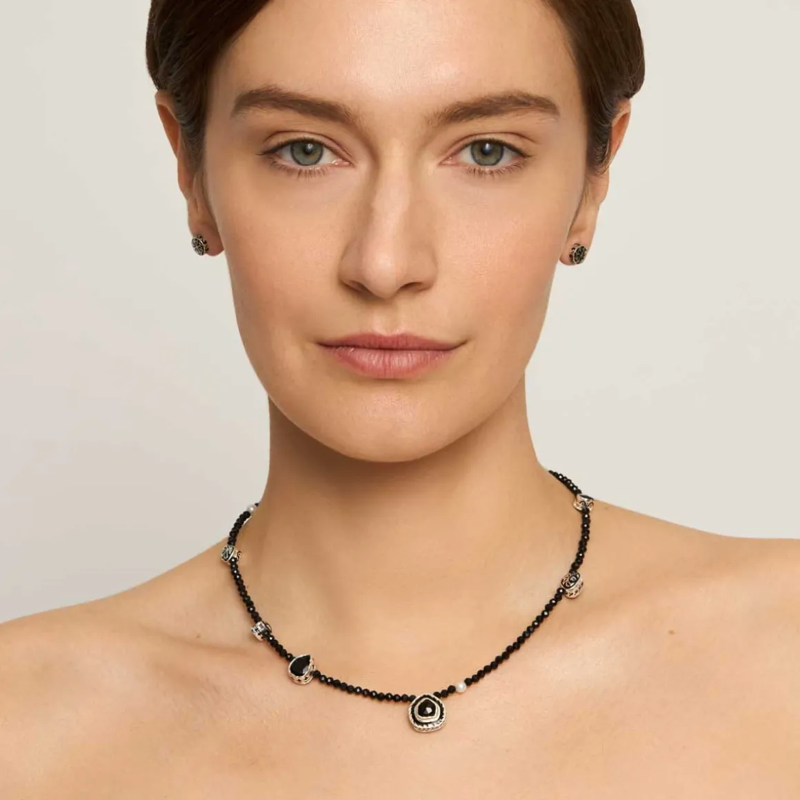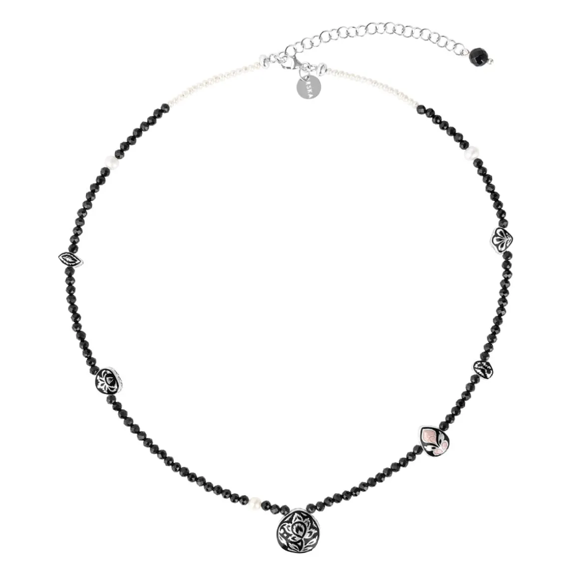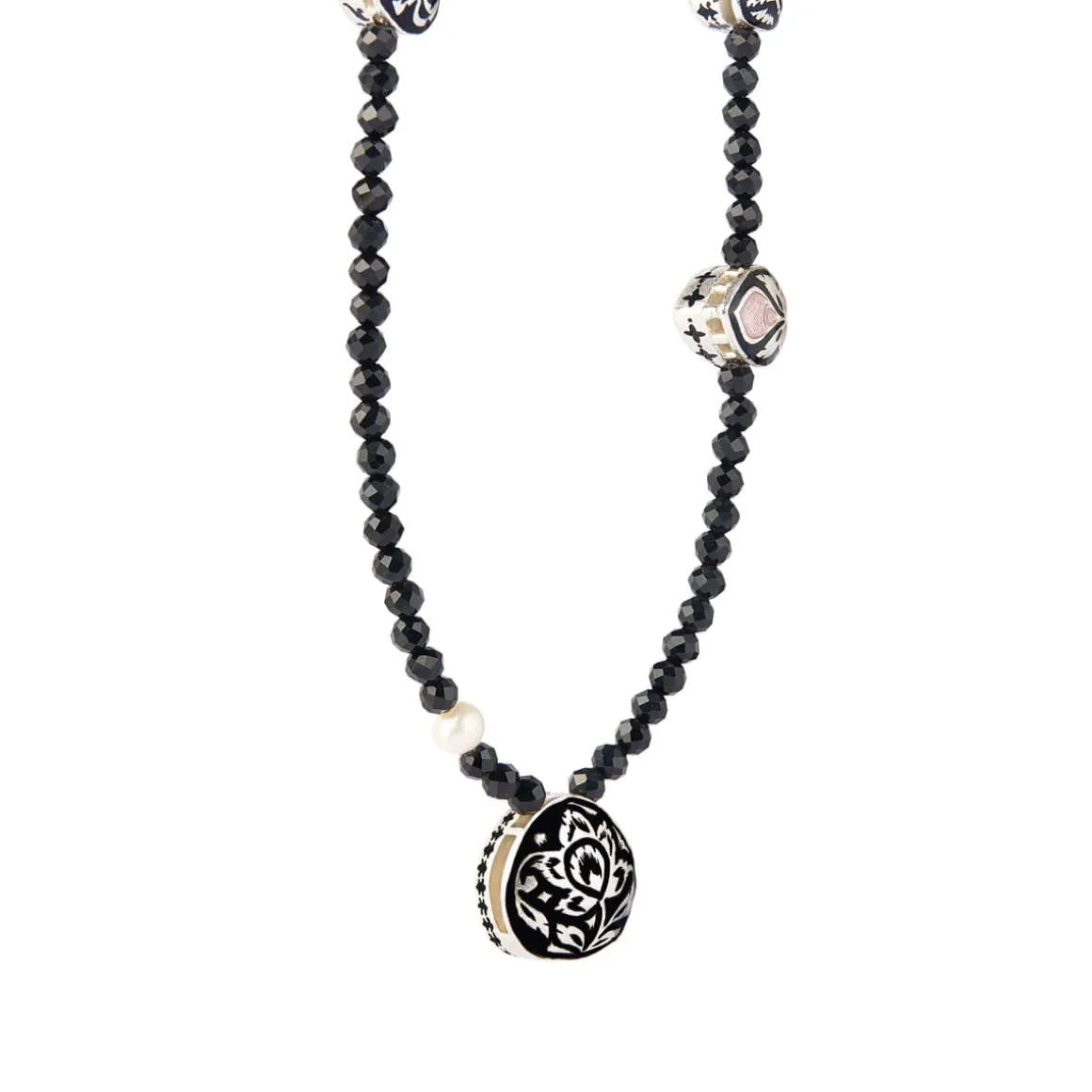 Efektowny naszyjnik powstał ze sznura fasetowanych onyksów, które tuż przy zapięciu dopełniają jasne drobne perły. Naszyjnik zdobi sześć dwustronnych srebrnych zawieszek. Z jednej strony zawieszki ozdobione są czarnymi i pudrowo-różowymi ornamentami roślinnymi wykonanymi przez indyjskich mistrzów z Radżastanu w technice minakari. Z drugiej strony zawieszki zdobione są czarnym kundan glass czyli wysokiej jakości szlifowanym szkłem indyjskim oprawionym w srebro. Kombinacja onyksów, pereł i emaliowanych zawieszek tworzy bogatą, wielowarstwową kompozycję.
