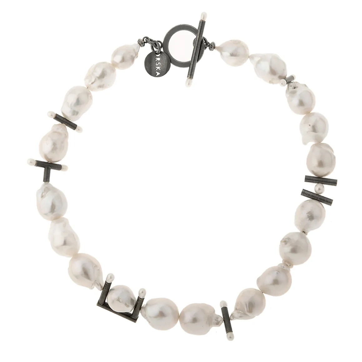 Unikatowa kolia powstała z nieregularnych pereł hodowlanych. Całość została przełamana różnorodnymi, minimalistycznymi elementami wykonanymi ze srebrnych rurek zamkniętych drobnymi perłami słodkowodnymi. Minimalistyczne wzornictwo biżuterii artystycznej zderzone z efektowną, kremową doskonałością pereł przedstawia współczesną interpretację kolii według projektantki. Wyrazisty naszyjnik jest bardzo efektowny. Świetnie sprawdzi się jako uzupełnienie wieczorowego stroju lub nietuzinkowy akcent casualowej stylizacji.