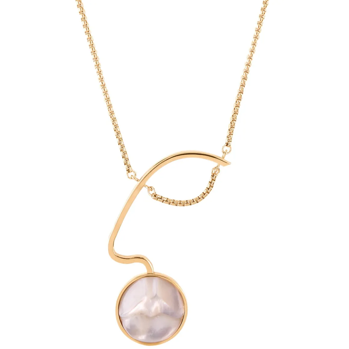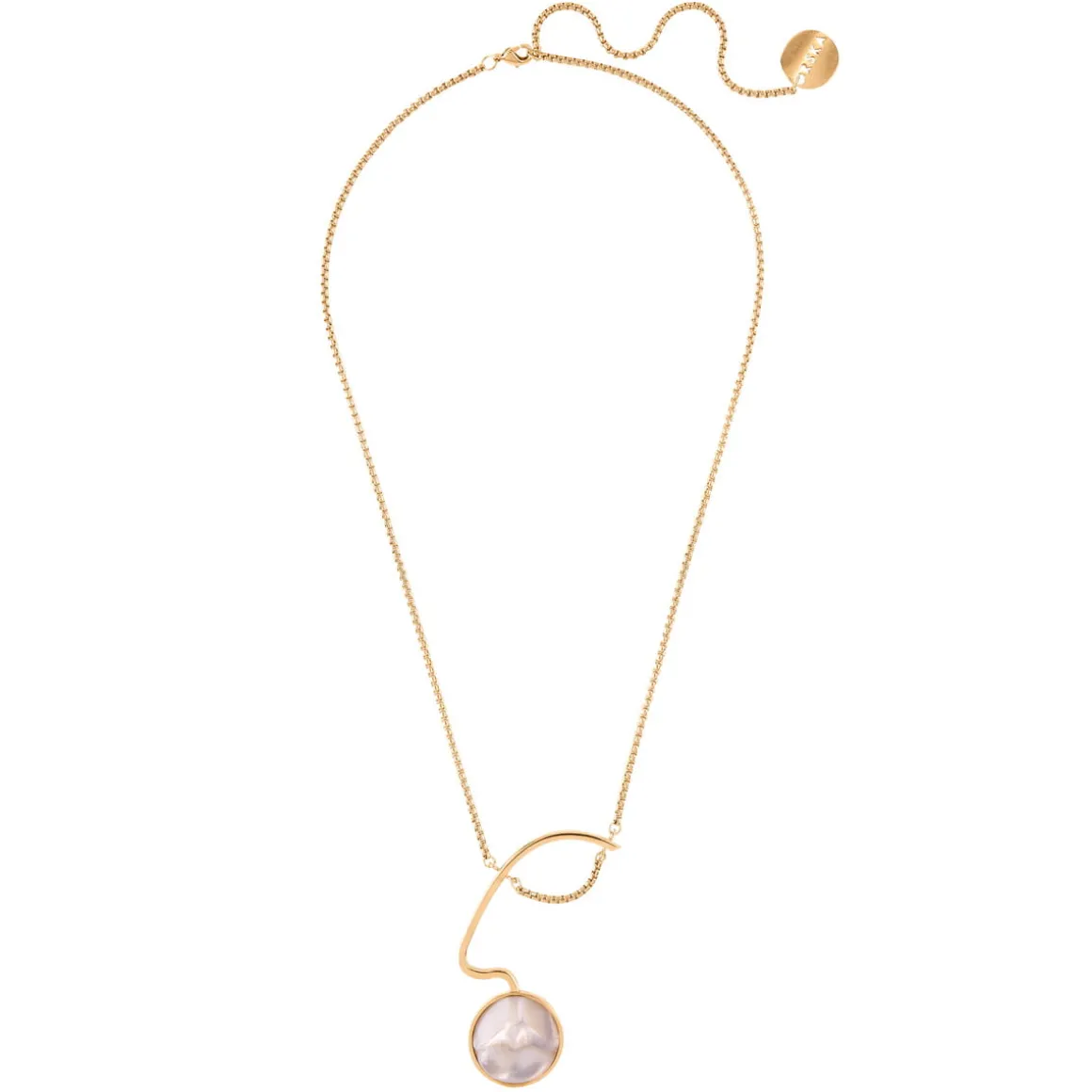 W pracowni ORSKA na delikatnym łańcuszku zawiesiliśmy geometryczną zawieszkę z pozłacanego mosiądzu. Jej centralnym elementem są mleczne usta wyrzeźbione w masie perłowej. Ciepły kolor pozłacanego metalu współgra z połyskującą perłową poświatą tworząc romantyczną kompozycję. Usta zostały dopełnione prostą, geometryczną formą, która imituje nos oraz oko uchwycone z profilu. Jej minimalizm kontrastuje z wydatnym i realistycznym kształtem rzeźbionych ust, tworząc intrygujący zestaw. Naszyjnik jest regulowany i można go nosić na dwóch różnych wysokościach. Masa perłowa jest materiałem naturalnym i poszczególne naszyjniki mogą nieco różnić się od siebie.