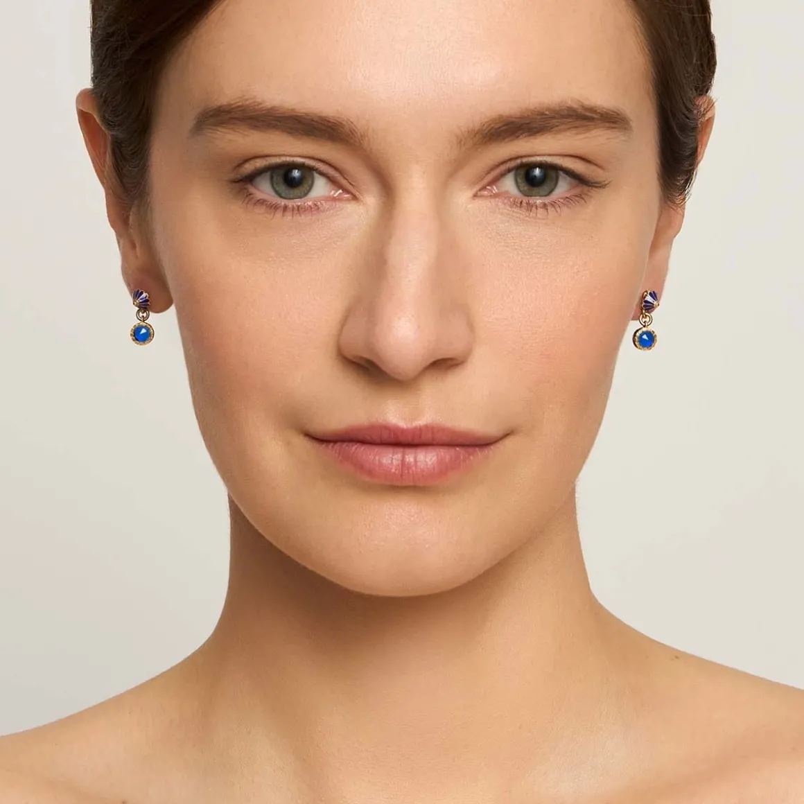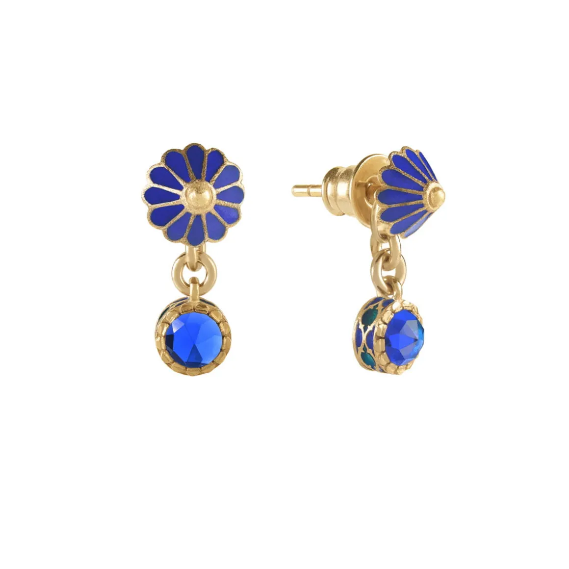 Kolczyki składają się z dwóch elementów: okrągłych rozet, do których przytwierdzone są sztyfty oraz bogato zdobionych zawieszek. Centrum rozety jest złote, a ku brzegom rozpościerają się ręcznie malowane wzory w kolorze indygo, kształtem przypominające płatki kwiatu. Do rozety przymocowano ozdobną zawieszkę, w której centrum znajduje się kundan glass – szklany kamień oprawiony w srebro pozłacane. Kundan glass w tej parze kolczyków ma intensywny niebieski kolor i fasetowaną powierzchnię, która odbija światło. Brzegi zawieszki zdobi minakari czyli emalia mineralna w odcieniach zieleni i błękitu, nakładana warstwami i wypalana w piecu. Kolczyki możesz nosić w dwóch wersjach: krótszej lub dłuższej. Jeśli chcesz uzyskać delikatne kolczyki na sztyfcie wystarczy, że odepniesz wiszące zawieszki.