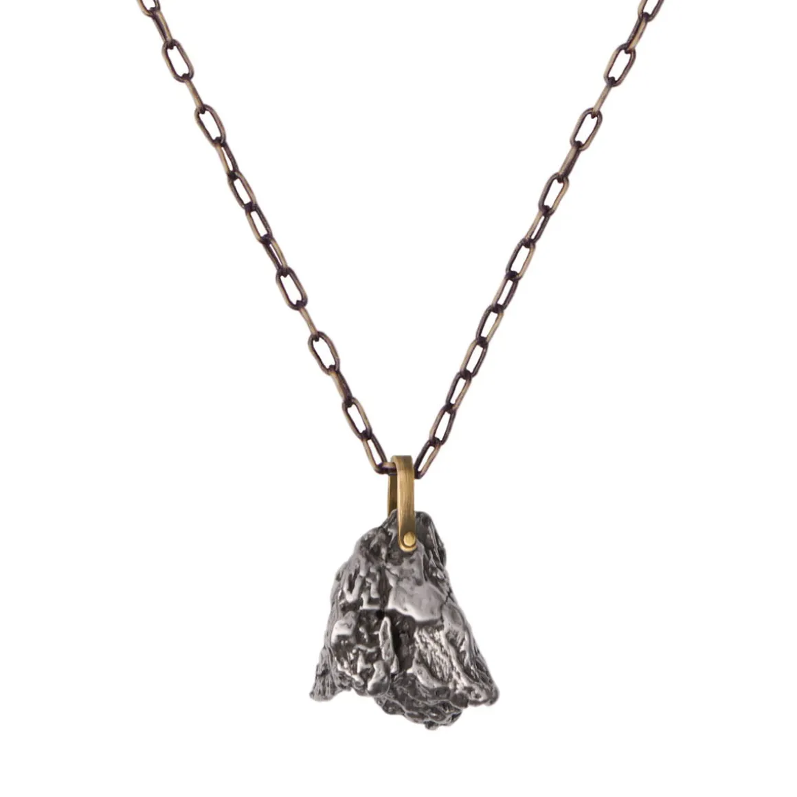 Duża nieregularna bryła meteorytu Campo del Cielo została złapana w delikatną, mosiężną oprawę, dzięki której prawdziwy fragment Kosmosu jest gwiazdą całej kompozycji! Każda zawieszka jest inna – surowa faktura i nieregularny kształt meteorytu sprawiają, że żaden naszyjnik nie wyglądają tak samo. To właśnie wyjątkowość nadaje biżuterii z tej kolekcji autentyczny, niepowtarzalny charakter. Bryłka zawieszona jest na mosiężnym, łańcuchu w kolorze starego złota o dużych oczkach, które pozwalają na całkowicie swobodną regulację – możesz nosić naszyjnik krótko pod szyją albo w dłuższej wersji, tworząc luźniejszy casualowy look.