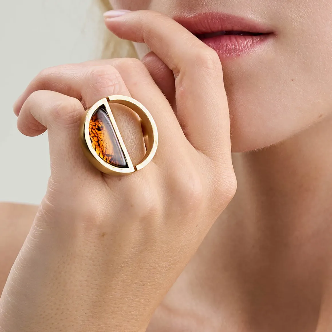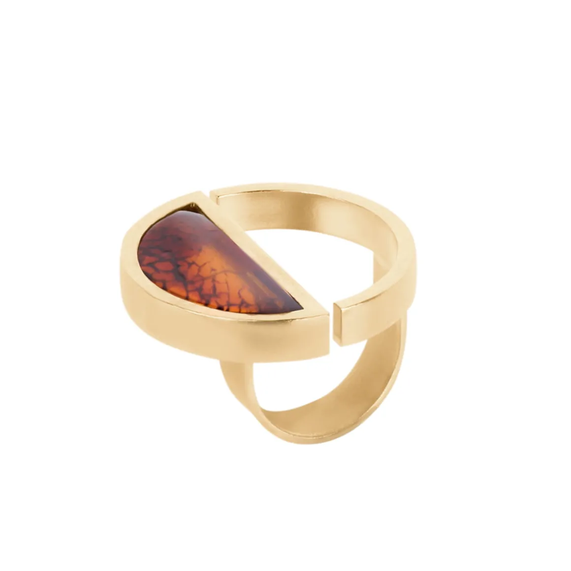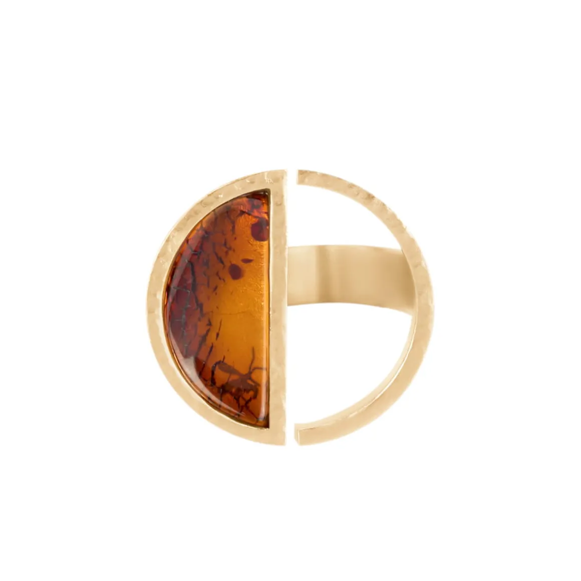 Pierścionek z kolekcji Baltica wykonaliśmy z pozłacanego mosiądzu i transparentnego bursztynu. Pierścionek ma formę okręgu. Jedna jego połowa jest pusta, dzięki temu ma lekki, ażurowy charakter. Druga wypełnione jest bursztynem w ciepłej, miodowej barwie. Przez złoty kamień, niczym przez szybę, przeziera grawer drobnego owada, który przypomina naturalną inkluzję. Front pierścionka zdobi młotkowane wykończenie, kontrastujące z resztą w satynowej estetyce. Dzięki geometrycznej formie i szerokiej obrączce pierścionek ma minimalistyczny, współczesny charakter.