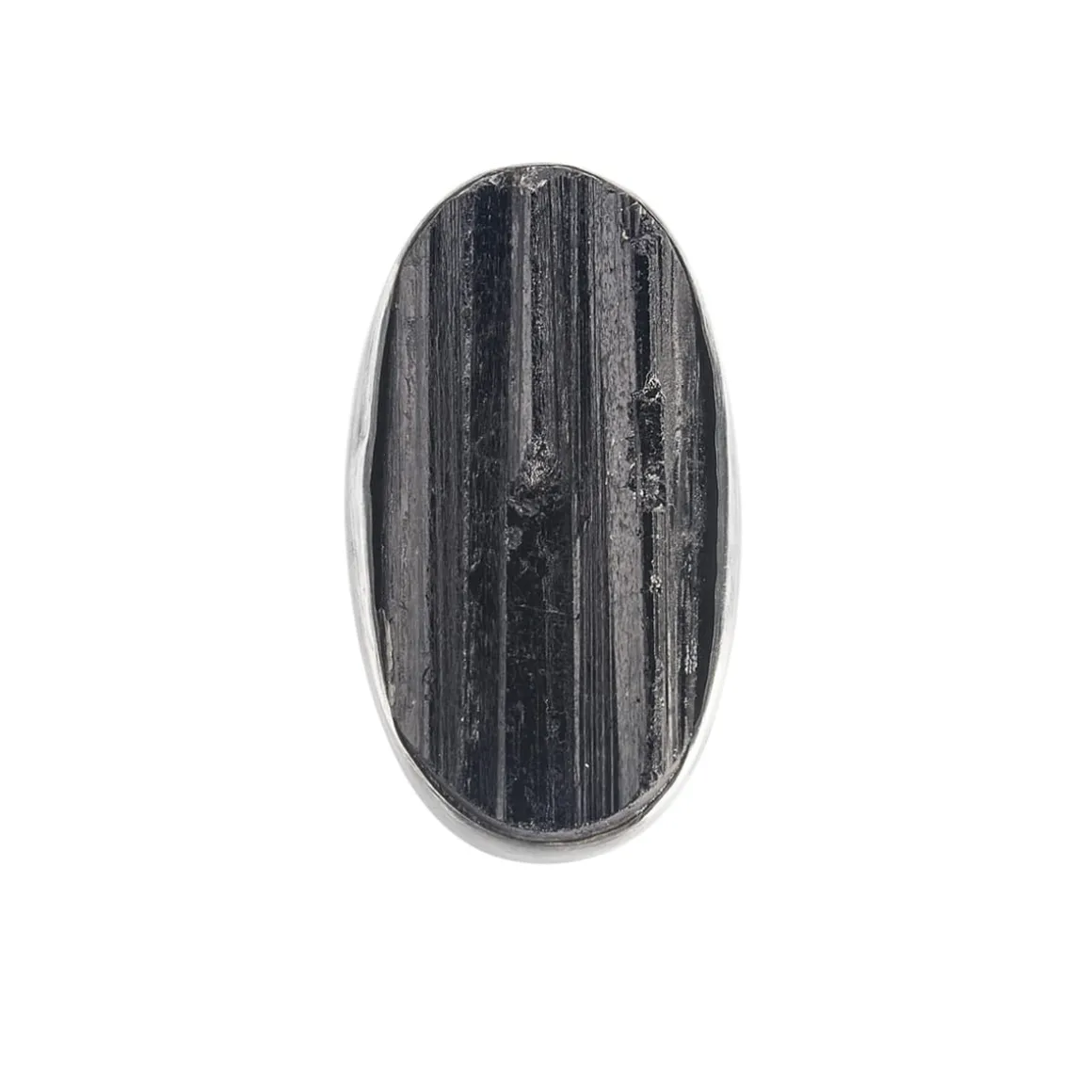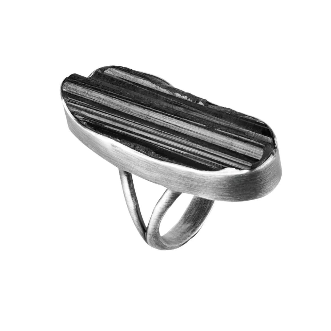 Efektowny pierścionek ORSKA został ręcznie wykonany ze srebra próby 925 poddanego oksydowaniu, dzięki czemu uzyskał głęboki, grafitowy odcień. Jego sercem jest duży, podłużny kamień – czarny turmalin zwany szerlitem – osadzony w szerokiej oprawie na podwójnej obrączce. Kamień jest nieoszlifowany, lecz łupany. Naturalna faktura minerału, pełna charakterystycznych żłobień i rys, nosi ślady po dłucie, niczym drewno rysunek słojów.