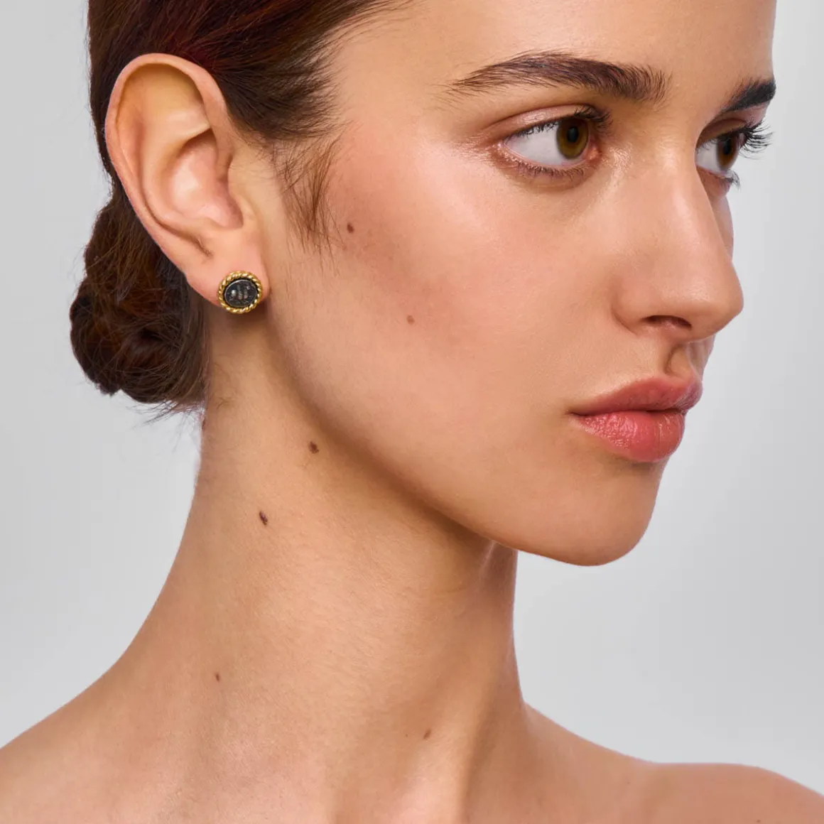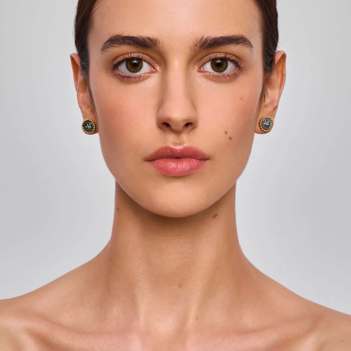 Drobne kolczyki z kolekcji Semios zostały wykonane ręcznie w naszej pracowni. Uwagę przyciągają okrągłymi fragmentami medalionów z wizerunkiem Koziorożca. Powstały one z oksydowanego srebra, którego grafitowe wykończenie podkreśla tajemniczy charakter tego mitologicznego symbolu i kontrastuje z oprawami w kształcie ozdobnej plecionki wykonanymi z pozłacanego mosiądzu. Kolczyki są lekkie, osadzone na wygodnym sztyfcie i doskonale sprawdzą się jako towarzysz codziennych stylizacji.