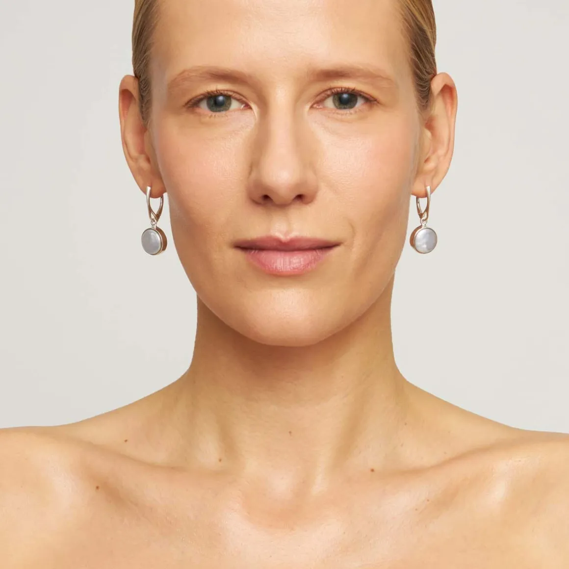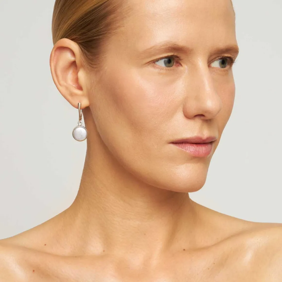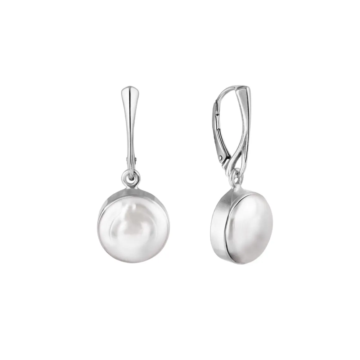 Kolczyki wykonane zostały ze srebra próby 925. Na biglach angielskich umocowano okrągłe słodkowodne perły oprawione w indywidualnie dopasowane ramy, które podkreślają ich kształt. Perły mogą delikatnie różnić się między sobą – nie ma dwóch takich samych egzemplarzy, każdy jest jak unikatowa rzeźba. Ma własną linię, ciekawy kształt i wyróżniający charakter.