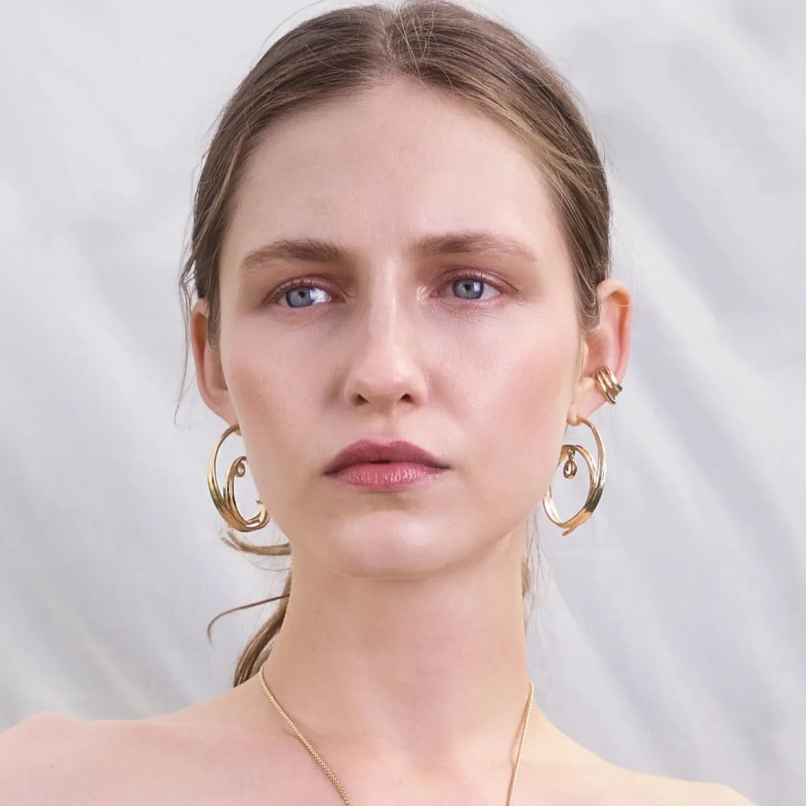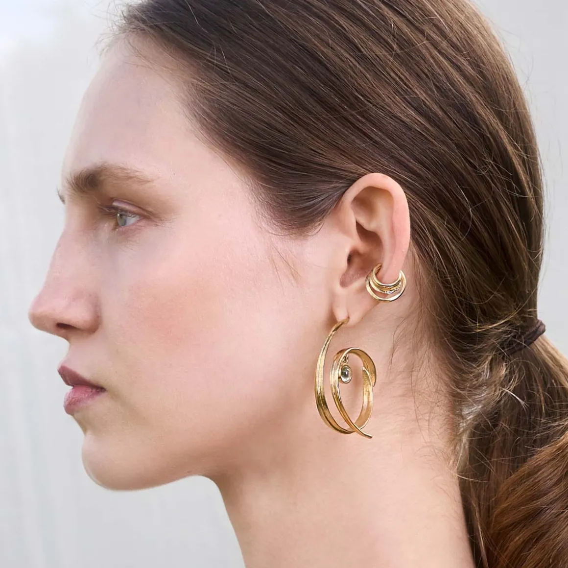 Asymetryczne kolczyki wykonaliśmy ręcznie z pozłacanego mosiądzu. Każdy kolczyk ma formę spirali, która symbolizuje ciągłość i cykliczność natury. Delikatne kryształy górskie, umieszczone w centrum spirali, są idealnie transparentne. Ze względu na swój kształt i klarowność przypominają krople rosy. Złocenie mosiądzu nadaje kolczykom eleganckiego wyglądu, podczas gdy organiczny kształt spirali przywodzi na myśl naturalne formy i struktury. Ta asymetryczna para kolczyków wyróżnia się artystycznym designem, nowocześnie interpretując formy inspirowane naturą.