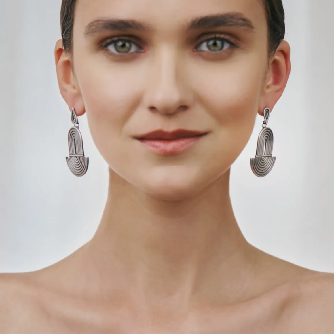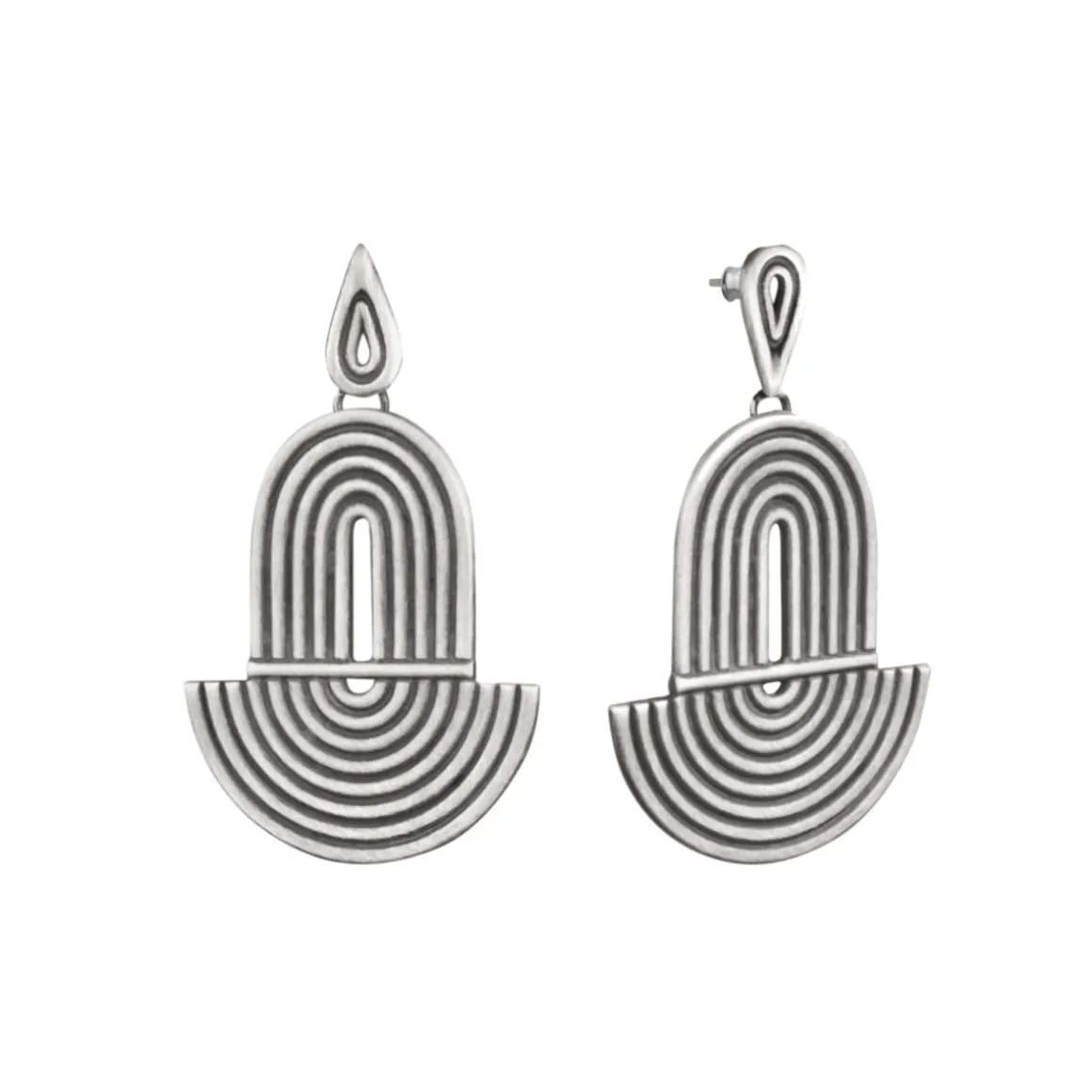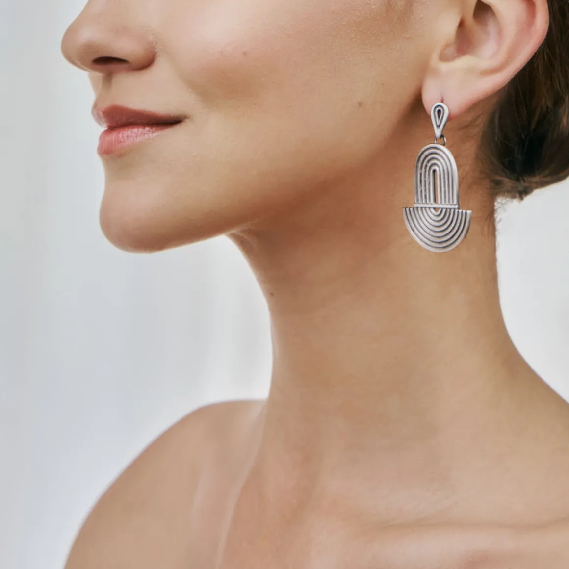 Kolczyki inspirowane żywiołem wody zostały wykonane ręcznie w pracowni ORSKA. Dwa ozdobne elementy odlane ze srebra i oksydowane (dla uzyskania grafitowego koloru) połączono drobnym ogniwem, a następnie umieszczono na srebrnych sztyftach. Pierwszy z nich ma kształt ozdobnej kropli. W drugiej części kolczyka powierzchnia złożona ze srebrnych pręcików, połączonych w większe półkola, nawiązuje do okręgów powstających na zakłóconej tafli wody. Ponadczasowa forma i uniwersalny charakter pozwala łączyć kolczyki zarówno z grubym swetrem, jak i letnią sukienką. Kolczyki występują również w złotej wersji kolorystycznej.