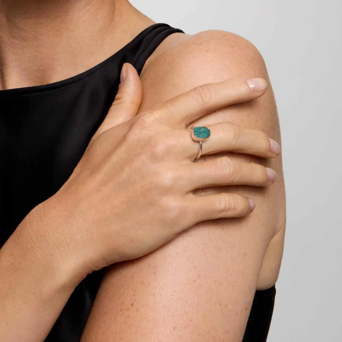 Pierścionek z kolekcji Aurora wyróżnia się naturalnym pięknem surowego akwamarynu. Kamień w odcieniach morskiej zieleni i błękitu został osadzony w oprawie ze srebra próby 925 i przymocowany do delikatnej, subtelnej obrączki. Nieregularna, nieoszlifowana forma akwamarynu sprawia, że każdy egzemplarz jest unikatowy – tak jak niepowtarzalna jest każda zorza polarna, która zainspirowała powstanie tej kolekcji. Akwamaryn symbolizuje spokój, harmonię i czystość – jest kamieniem sprzyjającym wyciszeniu i odwadze w wyrażaniu emocji. Połączenie minimalistycznej obrączki z pełnym życia, naturalnym minerałem tworzy biżuterię, która podkreśla indywidualny charakter i dodaje subtelnego blasku dłoniom.