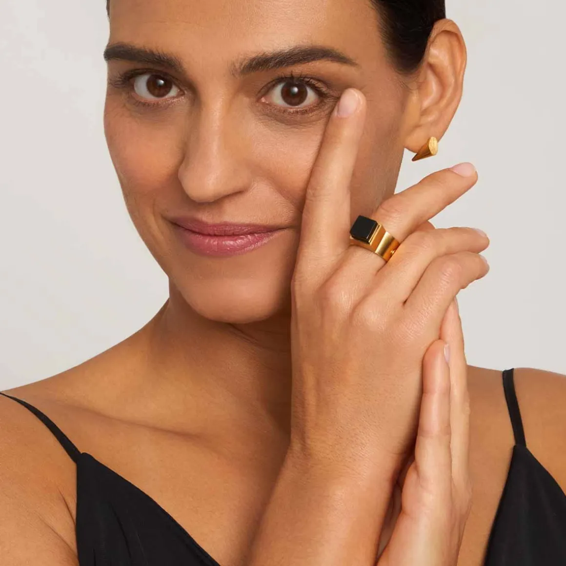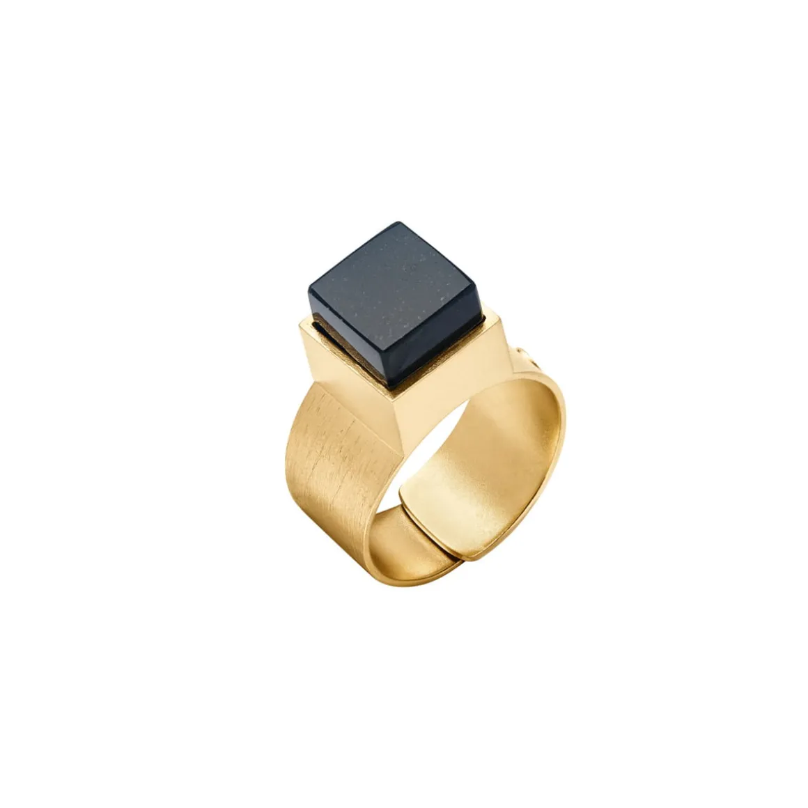 Pierścionek został wykonany ręcznie z pozłacanego mosiądzu w formie szerokiej obrączki o szczotkowanej fakturze. Na froncie znajduje się oczko w postaci kwadratowego, geometrycznie i precyzyjnie oszlifowanego czarnego jadeitu, który jest otulony przez lśniącą, gładką ramę. Kontrast między matową, drapaną powierzchnią obrączki a błyszczącą oprawą i głęboką czernią kamienia tworzy elegancką, wyrazistą kompozycję. Pomimo szerokiej formy, obrączka subtelnie oplata palec, a połączenie złota z czarnym jadeitem sprawia, że pierścionek staje się uniwersalnym, eleganckim modelem dla miłośników klasyki.