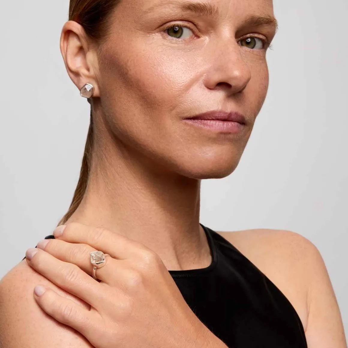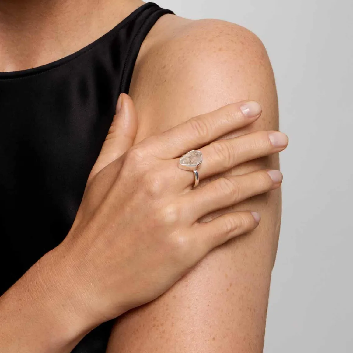 Pierścionek został wykonany ze srebra próby 925. Jego sercem jest duży kryształ górski w odmianie herkimer – minerał znany z wyjątkowej przejrzystości i charakterystycznych inkluzji w odcieniach złota i grafitu. Nieregularny kształt kamienia został podkreślony prostą, masywną obrączką, co sprawia, że biżuteria łączy w sobie surowość natury i elegancki minimalizm. Dzięki naturalnym różnicom w strukturze i inkluzjach każdy egzemplarz jest jedyny w swoim rodzaju – tak jak każda zorza polarna, która zainspirowała kolekcję Aurora.