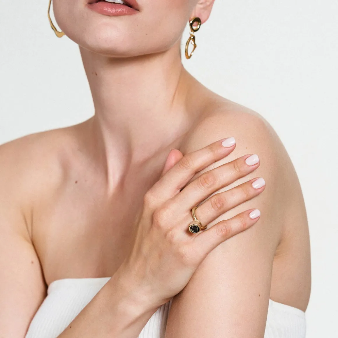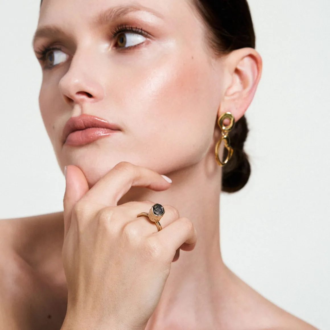 Niepokój o to, co pozostawimy po sobie przyszłym pokoleniom zainspirował ORSKA do opracowania koncepcji reinkarnacji poprzemysłowego plastiku, który został poddany eksperymentalnej obróbce. W efekcie tego procesu powstał syntetyczny kamień, który stanowi serce kolekcji New Stone. Lekka, czarna bryła o tęczowym połysku i fakturze przywodzącej na myśl krystalizację naturalnych minerałów została uformowana przez Weronikę Banaś z przetworzonego plastiku. Pierścionek został ręcznie wykonany z pozłacanego mosiądzu. Jego nieregularny kształt tworzy interesującą formę, która przyciąga uwagę.