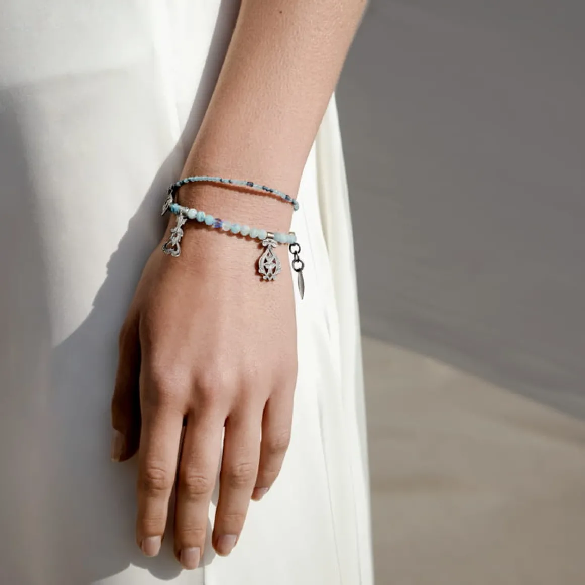 Bransoletka została wykonana ręcznie z kamieni naturalnych, oksydowanego srebra i mosiądzu. Cztery zawieszki powstały w lokalnym, marokańskim warsztacie. Mistrzowie z Marrakeszu wycięli misterny wzór i nadali mu ażurową strukturę. Chcąc podkreślić grę światłocienia, w warsztacie ORSKA biżuteria została oksydowana i zyskała grafitowy kolor, kontrastujący z naturalnymi kamieniami w odcieniach błękitu: akwamarynem i szafirem. Całość dodatkowo ozdobiono fasetowaną cyrkonią w złotej, mosiężnej oprawie. Bransoletka posiada kilkucentymetrową przedłużkę z niewielkim logotypem ORSKA i zamykana jest na jubilerski karabińczyk.