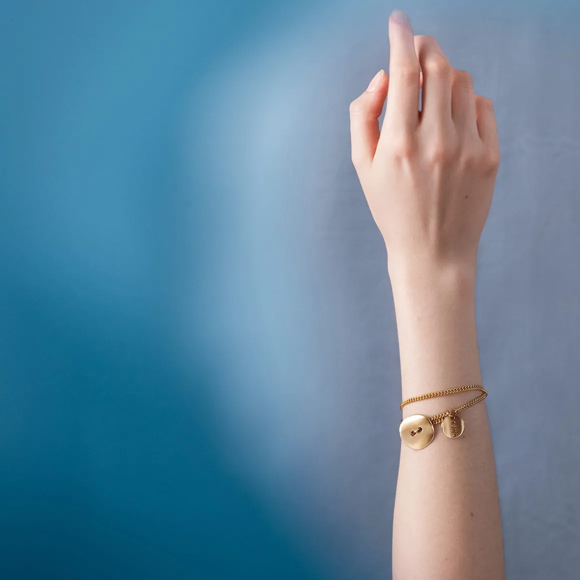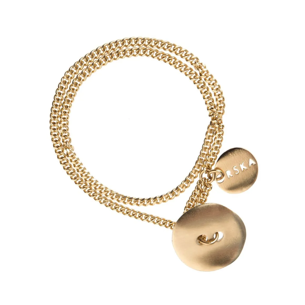 Ręcznie wykonana, pozłacana bransoletka z kolekcji Vintage dwukrotnie owijana wokół nadgarstka. Ozdobą bransolety jest zapięcie w formie guzika. Dzięki uniwersalnemu charakterowi i eleganckiej formie bransoletka będzie świetnym uzupełnieniem wielu kreacji zarówno codziennych jak i wieczorowych.