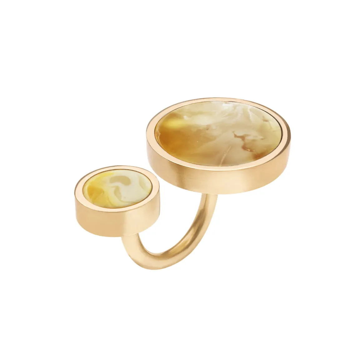 Asymetryczny pierścionek z dwoma mlecznymi bursztynami z kolekcji Baltica