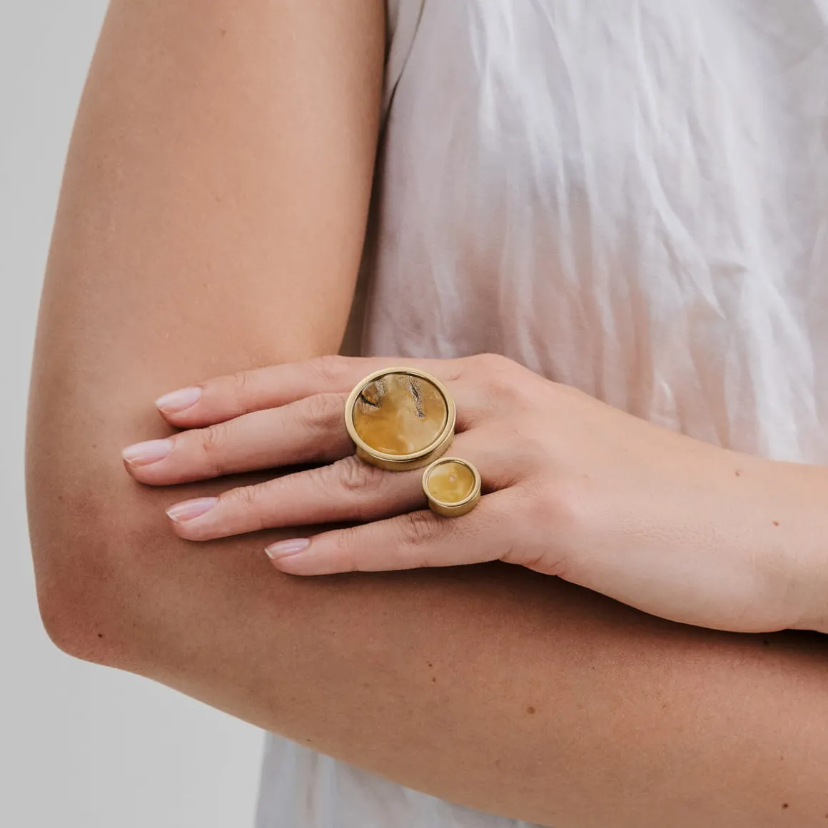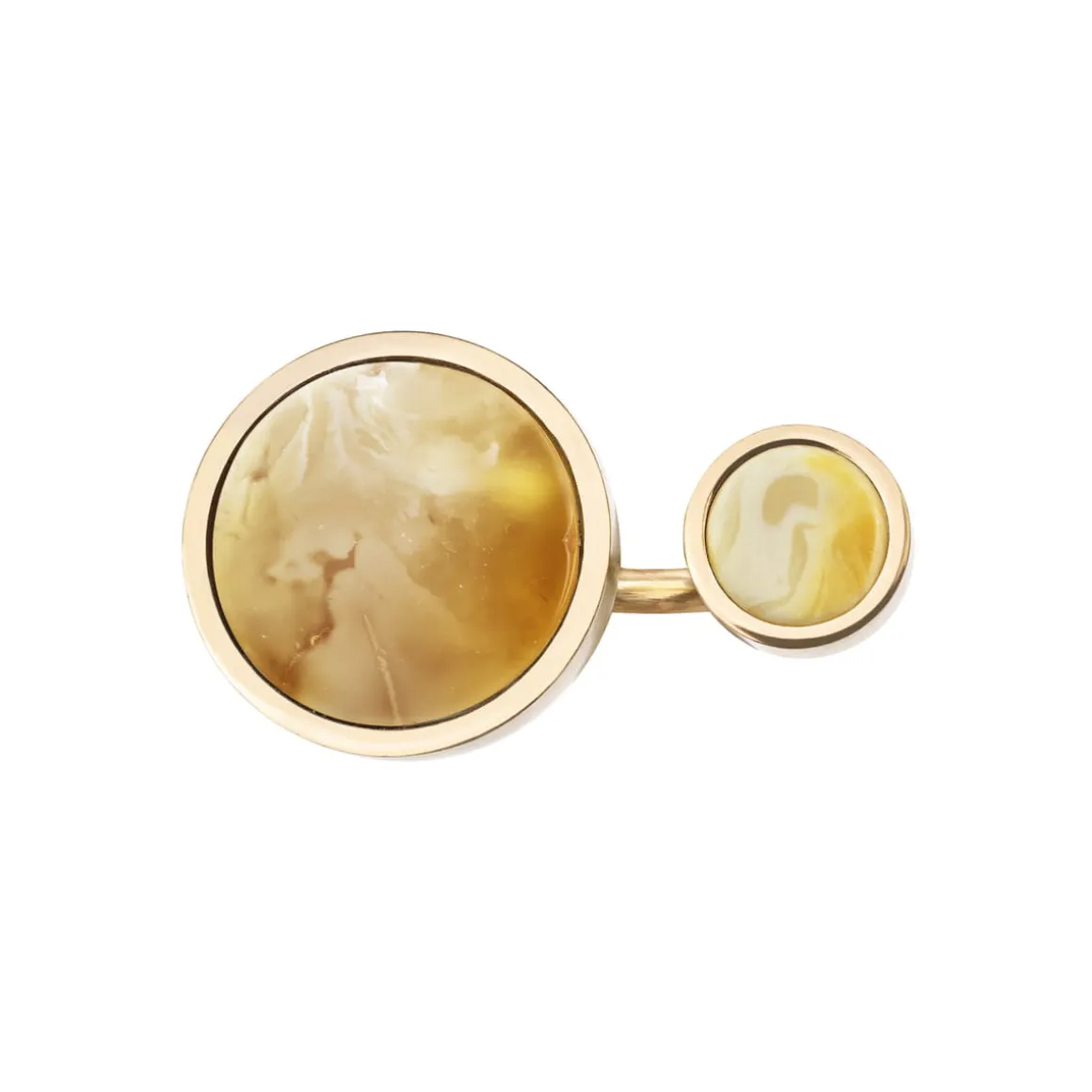 Asymetryczny pierścionek z bursztynem mlecznym został wykonany ręcznie. Dwa okrągłe kamienie naturalne o mlecznej barwie kontrastują ze sobą pod względem wielkości. Obydwa bursztyny oprawiono w pozłacany mosiądz. Prosta, geometryczna forma podkreśla unikatowość i naturalne piękno surowca. Design jest tłem dla prawdziwej gwiazdy kolekcji – stworzonego miliony lat temu bursztynu. Na naszej stronie internetowej w zakładce rozmiary znajdują się wskazówki jak odpowiednio dobrać rozmiar pierścionka.