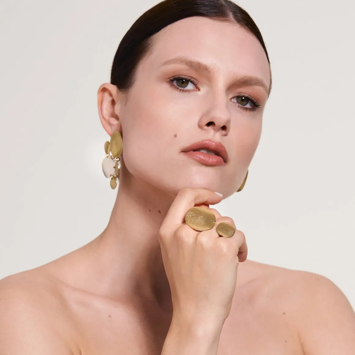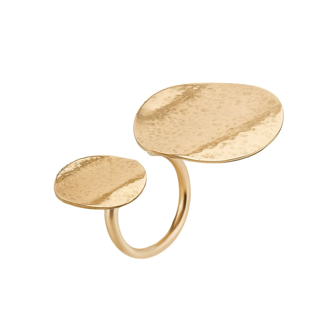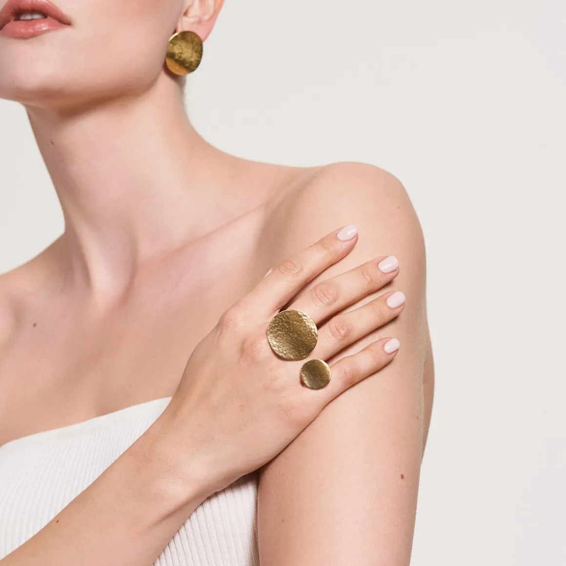 Woda niesie ze sobą życie. Jest symbolem odrodzenia i wytrwałości. W pracowni ORSKA podjęliśmy próbę przełożenia majestatu żywiołu wody na oryginalny pierścionek. Na otwartej obrączce umieściliśmy dwa dyski o pofalowanej strukturze i ręcznie kutej powierzchni. Ich wygląd nasuwa skojarzenia z oświetloną słońcem, a jednocześnie zmąconą kroplami letniego deszczu, taflą wody. Pierścionek z kolekcji Rundo został odlany z mosiądzu, a następnie pokryty złotem.