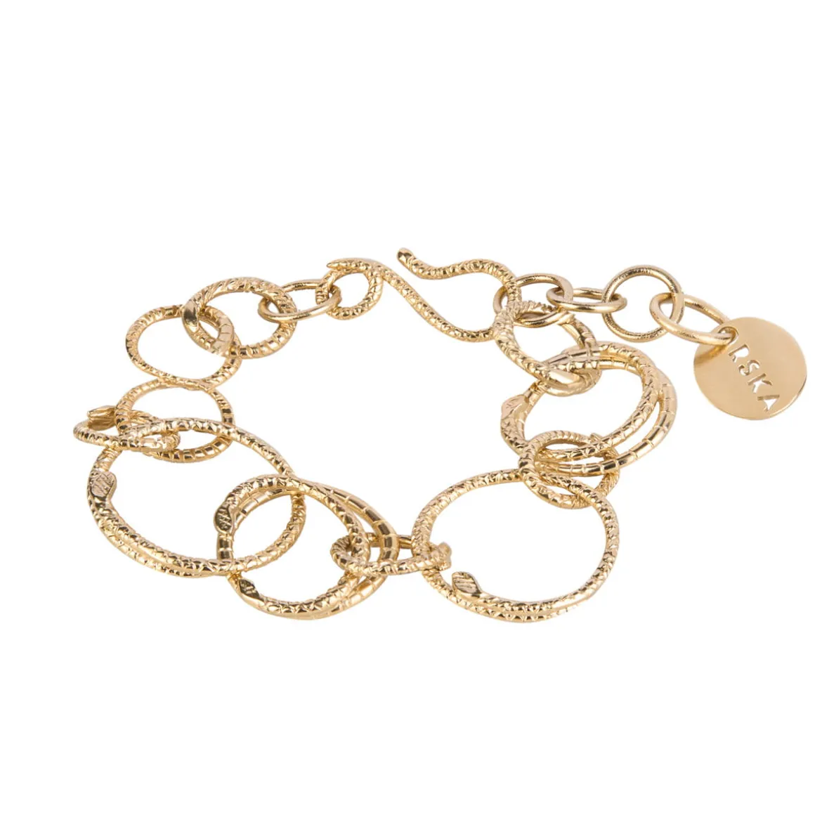 Artystyczna bransoletka z wężowych ogniw została wykonana ręcznie w poznańskiej pracowni, jednak pomysł na nią zrodził się jeszcze w trakcie podróży projektantki Anny Orskiej na Bali. Wężowe ogniwa z pozłacanego mosiądzu tworzą wygodny łańcuch z zapięciem na artystyczny haczyk, który umożliwia łatwe zamykanie i regulację długości. Kompozycję uzupełnia podwieszone logo ORSKA. Bransoletki ORSKA są dostępne w rozmiarach zarówno damskich jak i męskich. W zakładce rozmiary znajdziesz wskazówki, jak wybrać właściwy rozmiar bransoletki.