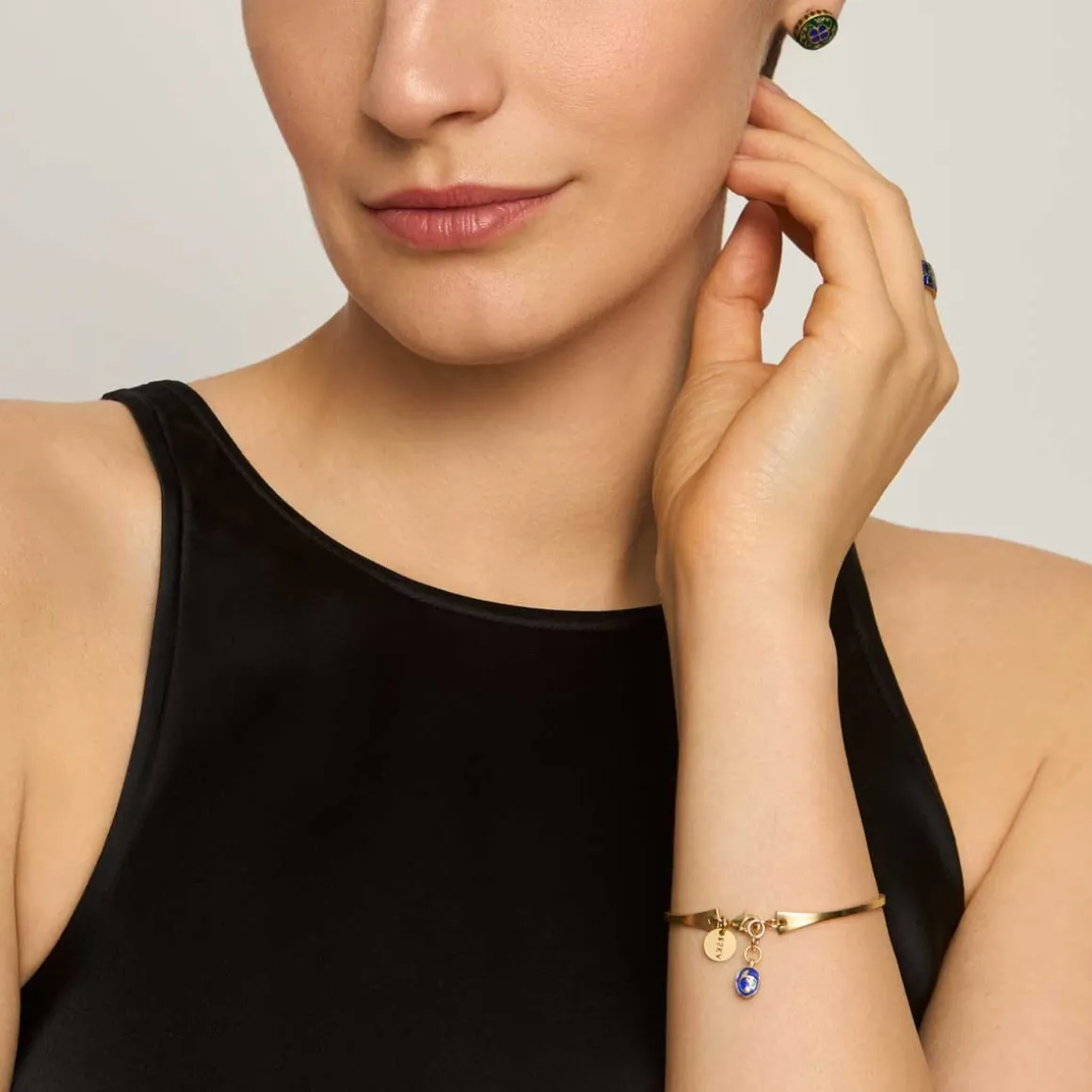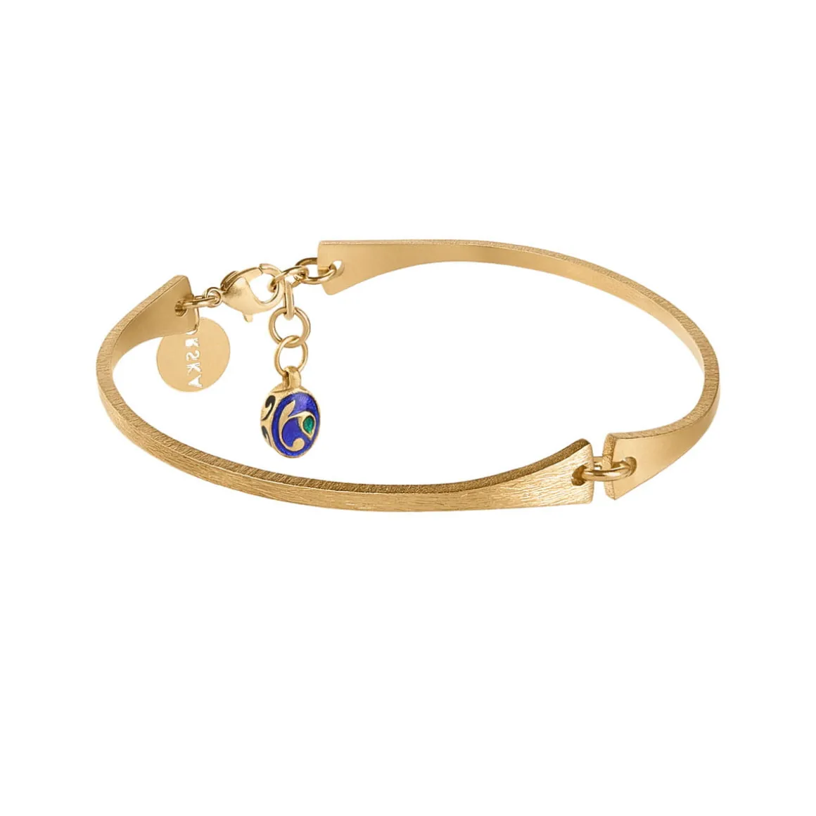 Bransoletka wykonana z pozłacanego srebra powstała w pracowni ORSKA z dwóch sztywnych łuków o kontrastującym wykończeniu powierzchni, połączonych delikatnym ogniwem i tworzących lekką, geometryczną formę. Całość uzupełnia regulowana przedłużka zakończona ozdobną zawieszką z barwnym wzorem. Z jednej strony zawieszki zielono-niebieskie ornamenty układają się w motyw liści – symbol więzi, tradycji i ciągłości. W indyjskiej symbolice liście i pnącza oznaczają trwałe połączenie z naturą oraz rytm powtarzających się cykli życia. Druga strona zdobiona jest kwiatowym motywem z kolorowej emalii, w którym zieleń symbolizuje harmonię, a błękit – wewnętrzny spokój. Brzegi zawieszki dopełniają geometryczne ornamenty z czarnej emalii, nadając całości wyrafinowany, artystyczny charakter. Bogato zdobione elementy wykonane zostały w warsztacie w Radżastanie, który Anna Orska odwiedziła w trakcie wyprawy w poszukiwaniu ciekawych rzemiosł świata.
