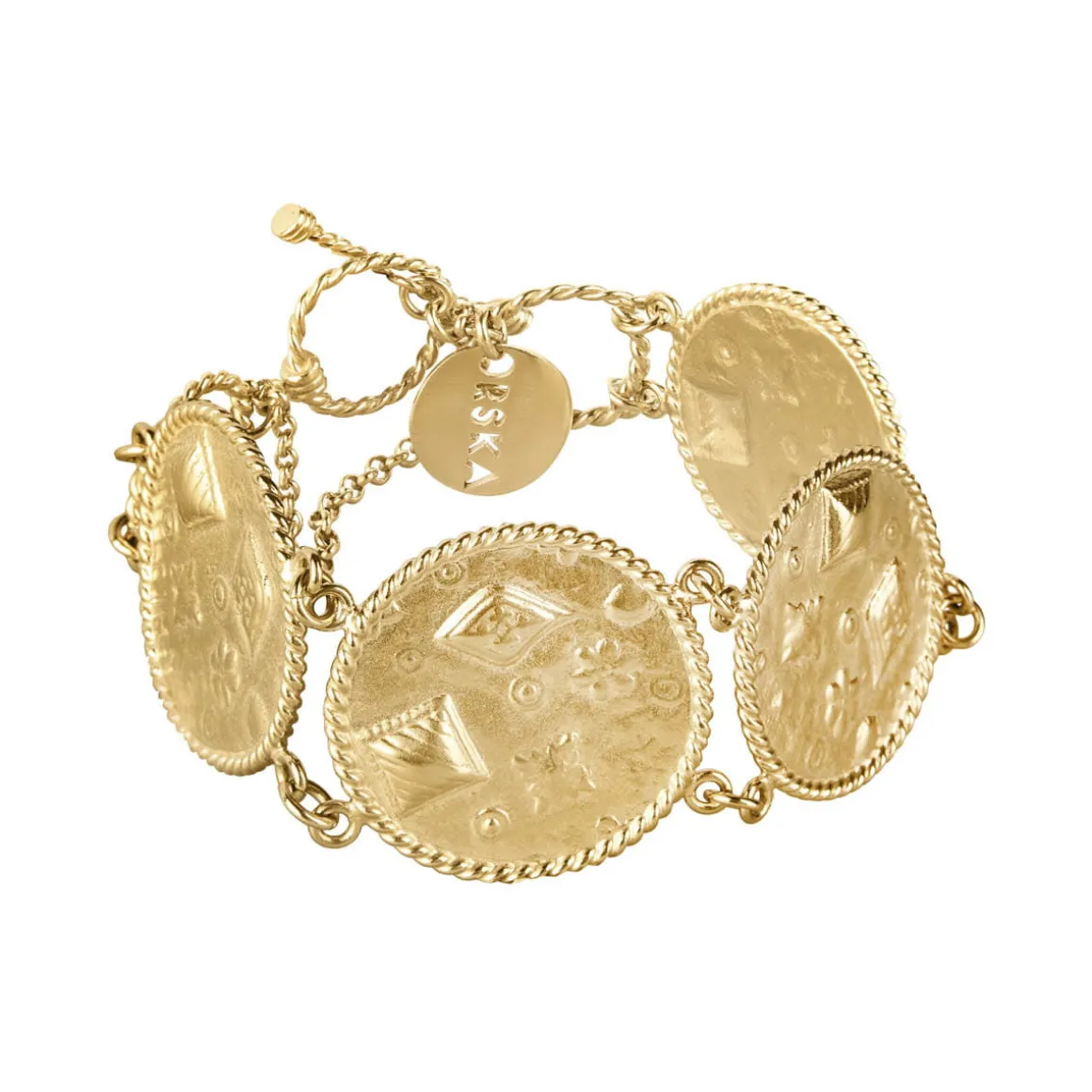 Bransoletka powstała z połączonych fragmentów medalionów wykonanych w naszej pracowni jubilerskiej z pozłacanego mosiądzu. Każdy z nich ozdobiony jest bogatymi ornamentami i wykończony dekoracyjną ramą przypominającą spleciony warkocz. Bransoletka zapinana jest na skobel, który ułatwia jej samodzielne zapięcie i jednocześnie stanowi ozdobny akcent.