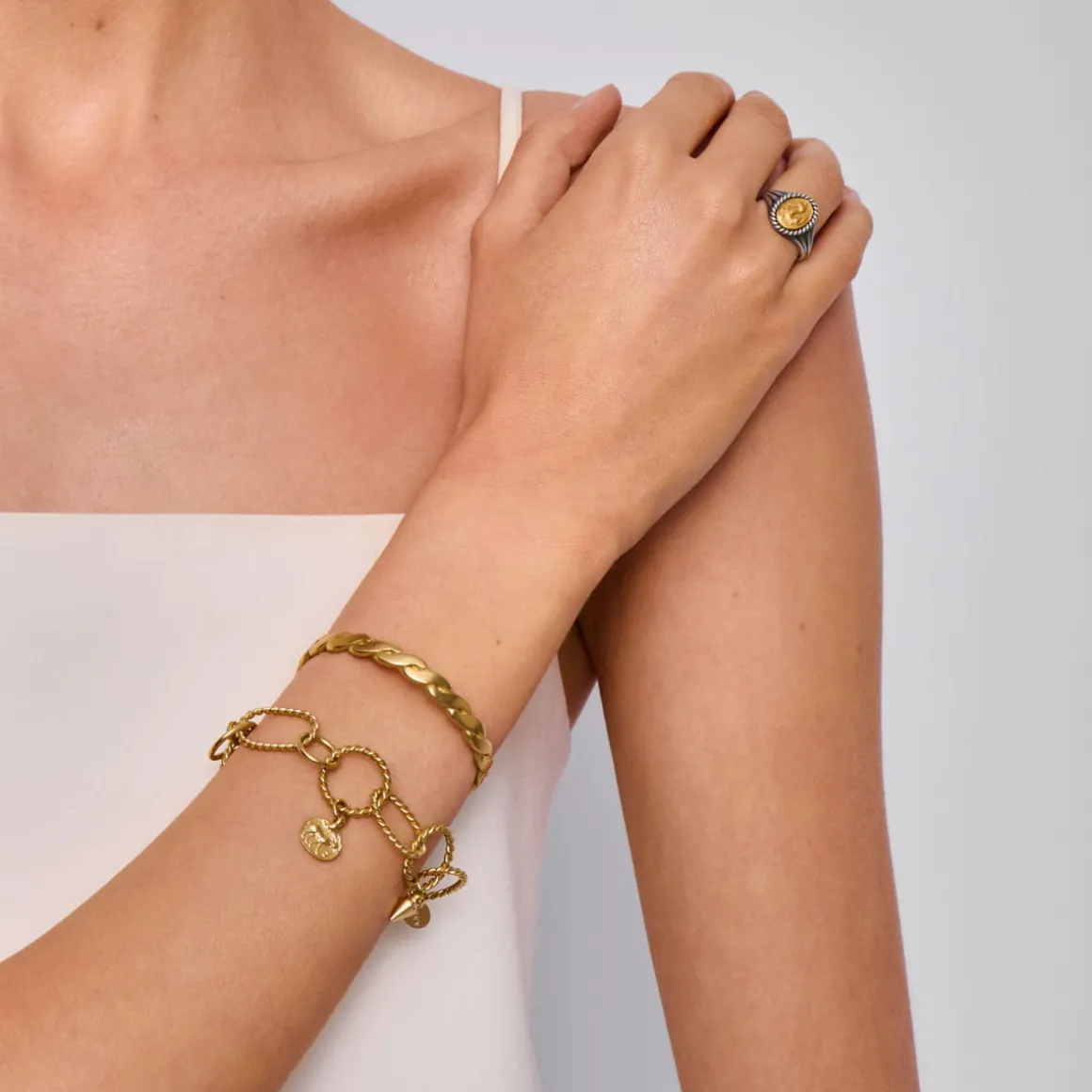Pozłacana bransoletka z kolekcji Semios doskonale wygląda solo, ale może być też świetnym dodatkiem do autorskich, warstwowych kompozycji. Zestaw ją z bransoletką o innym splocie łańcuszka np. z miękką bransoletką o nieregularnych ogniwach z kolekcji New Stone. Możesz też połączyć różne metale nosząc tę bransoletkę w towarzystwie grafitowej bransoletki z kolekcji Prato i srebrnej bransoletki bangle z kolekcji New Stone. Nie zapominaj też o kamieniach naturalnych, bursztynach czy perłach – takie nieoczywiste połączenia przyciągają wzrok, zbierają komplementy i dodają wyrazistości. Mieszaj, łącz, eksperymentuj – noś tak, jak lubisz.