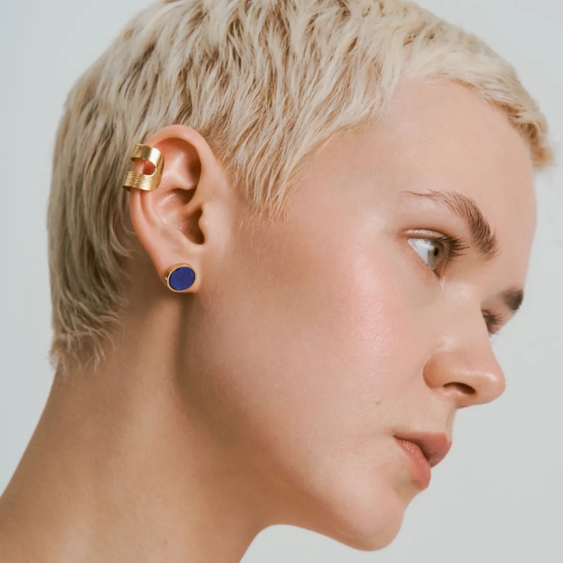 Nausznica z kolekcji Orini została wykonana ręcznie z pozłacanego mosiądzu w naszej jubilerskie pracowni. Jej kształt delikatnie oplata ucho, podkreślając jego naturalną linię. Szczotkowana powierzchnia w połączeniu z gładkimi, matowymi fragmentami tworzy efektowny kontrast, który przyciąga uwagę. Geometryczne detale i drobne ryciny nadają projektowi artystycznego wyrazu, podkreślając jego nowoczesny charakter. Nausznica świetnie sprawdzi się jako samodzielny akcent, ale równie dobrze komponuje się z dużymi kolczykami w kształcie kół z lapis lazuli lub niebieską bransoletką z korali z tej samej kolekcji, tworząc stylowy i wyrazisty komplet.