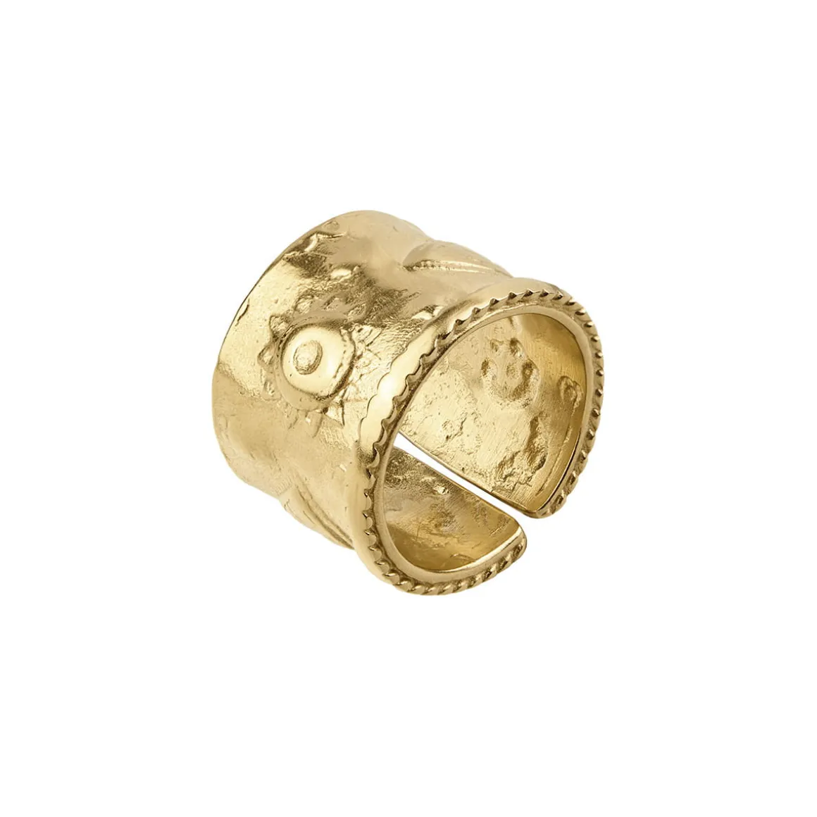 Ten szeroki pierścionek z kolekcji Semios został ręcznie wykonany w pracowni jubilerskiej ORSKA z pozłacanego mosiądzu. Jego powierzchnię zdobią ornamenty inspirowane tradycjami różnych kultur, w których zdobienia pełniły nie tylko funkcję dekoracyjną, ale również symboliczną i ochronną. Ornamenty obecne były na świątyniach, tkaninach, broni, naczyniach i oczywiście – biżuterii. Każdy wzór miał swoje znaczenie: spirale symbolizowały cykl życia, energię i odrodzenie; motywy roślinne odnosiły się do płodności i harmonii z naturą; formy geometryczne podkreślały porządek, nieskończoność i duchową równowagę. Charakterystyczna, lekko nieregularna faktura, subtelne żłobienia oraz ozdobnie wykończone krawędzie nadają tej szerokiej obrączce surowy, a zarazem szlachetny charakter.