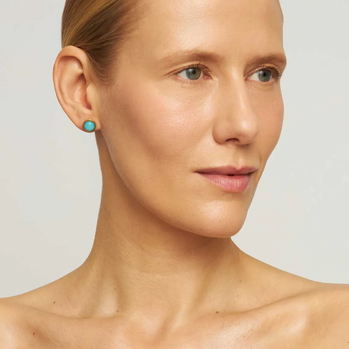Niewielkie okrągłe amazonity w błękitnym kolorze oprawione zostały w delikatne ramy z pozłacanego mosiądzu tworząc subtelny, ale wyrazisty dodatek. Każdy amazonit jest unikalny – naturalne różnice w odcieniu sprawiają, że każda para kolczyków jest niepowtarzalna. Zapinane na wygodny sztyft kolczyki są lekkie i idealne do noszenia przez cały dzień. Ich niewielki rozmiar czyni je uniwersalnymi, pasują zarówno do casualowych, jak i bardziej eleganckich stylizacji, dodając im odrobinę koloru.