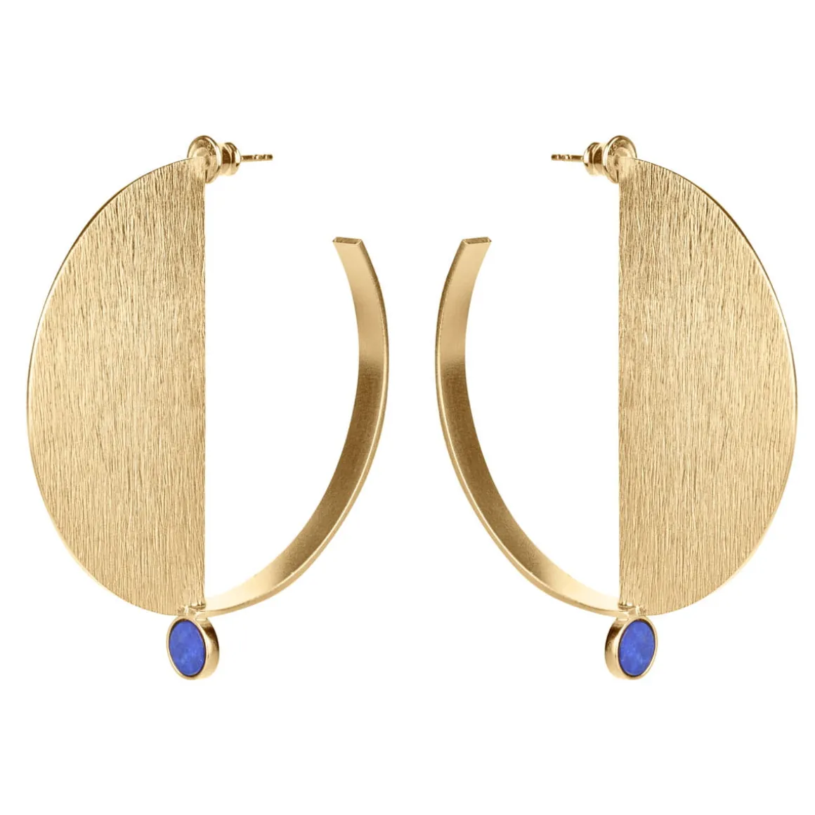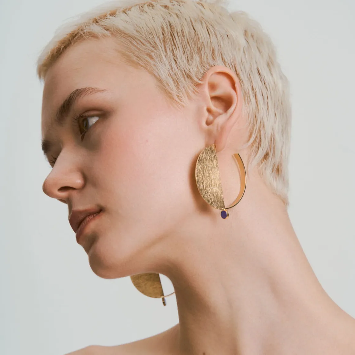 Geometryczne kolczyki z kolekcji Orini to połączenie minimalistycznego designu i wyrazistej formy. Wykonane ręcznie z pozłacanego mosiądzu, zachwycają kontrastem między satynową, szczotkowaną powierzchnią dużego, półkolistego elementu a delikatnym, głęboko niebieskim akcentem lapis lazuli w okrągłej oprawie. Ich asymetryczna konstrukcja tworzy efektowne wrażenie lekkości i nowoczesnej elegancji, idealnej zarówno na co dzień, jak i na specjalne okazje. Kolczyki doskonale uzupełniają inne elementy kolekcji Orini, takie jak bransoletki czy pierścionki, tworząc spójny zestaw dla miłośniczek niebanalnej biżuterii.