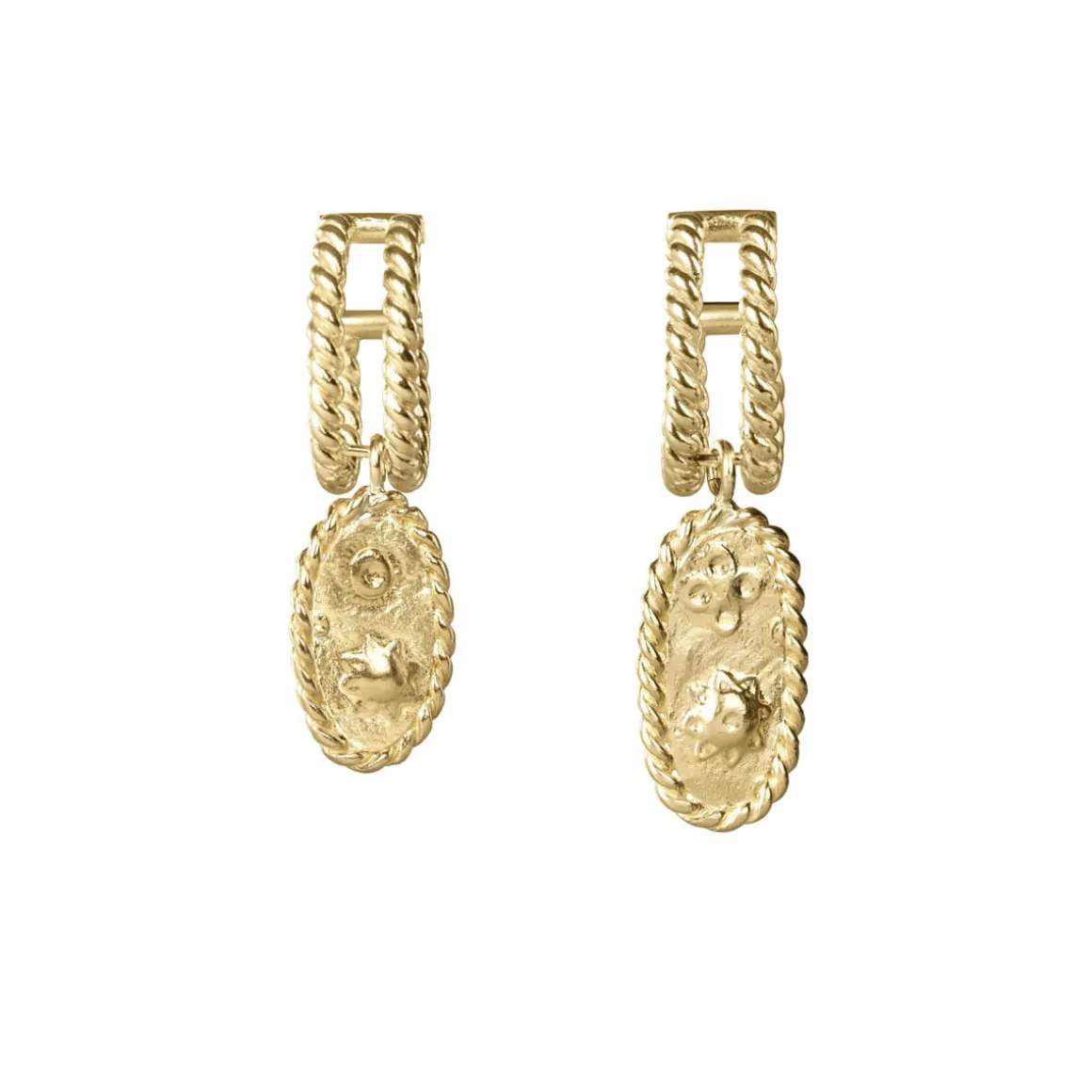 Kolczyki zostały wykonane ręcznie z pozłacanego mosiądzu. Podwoiliśmy klasyczną formę koła o oryginalne plecionej fakturze, a następnie ozdobiliśmy je podłużnymi zawieszkami, fragmentami dekoracyjnych medalionów. Każda z nich pokryta jest ozdobnym ornamentem. Kolczyki są asymetryczne (zawieszka na jednym z nich jest większa) dzięki czemu biżuteria ma ciekawy, przyciągający uwagę charakter. Kolczyki w zestawie z bransoletką i szeroką obrączką z tym samym motywem ornamentów, dopełnią klasyczne, monochromatyczne stylizacje nadając im oryginalnego wykończenia.