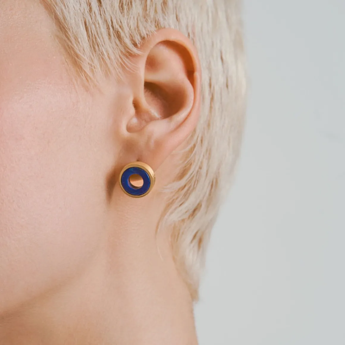Pozłacane kolczyki z kolekcji Orini wykonaliśmy w naszej jubilerskiej pracowni z mosiądzu, który pokryliśmy ciepłym złoceniem, nadając im eleganckiego blasku. Głównym elementem kolczyków jest pierścień z ultramarynowego lapis lazuli, którego piękno podkreśla ręczne szlifowanie. Naturalny kamień oprawiliśmy w pozłacane ramy. Subtelny okrągły kształt kolczyków czyni je uniwersalnym dodatkiem. Biżuteria doskonale sprawdzi się jako akcent do minimalistycznych stylizacji na co dzień, ale równie pięknie dopełni elegancki wieczorowy look. Kolczyki dostępne są również w srebrnej wersji kolorystycznej.