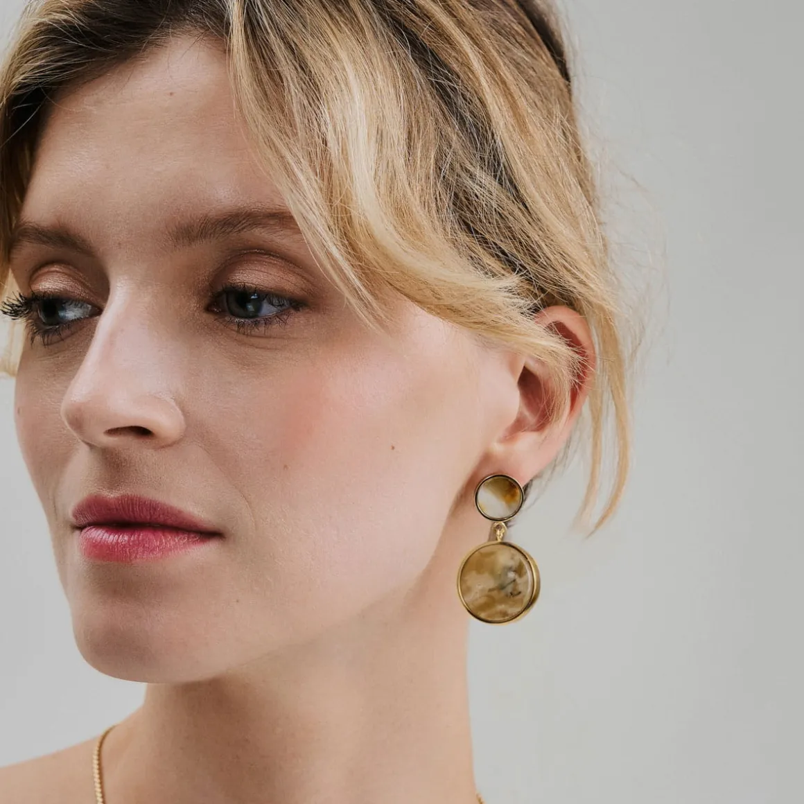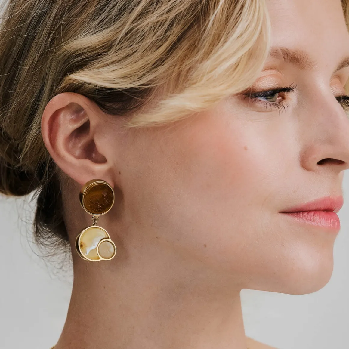 Jak zróżnicowane potrafią być kolory bursztynu pokazuje pięć okrągłych, wielobarwnych kamieni oprawionych w pozłacany mosiądz. Proste, geometryczne formy podkreślają unikatowość i naturalne piękno surowca. Nowoczesny design jest tłem dla prawdziwej gwiazdy kolekcji – stworzonego miliony lat temu bursztynu. Kamienie różnią się między sobą kolorem oraz inkluzjami, dzięki czemu każda para kolczyków jest unikatowa. Kolczyki są w 100% wykonane ręcznie.