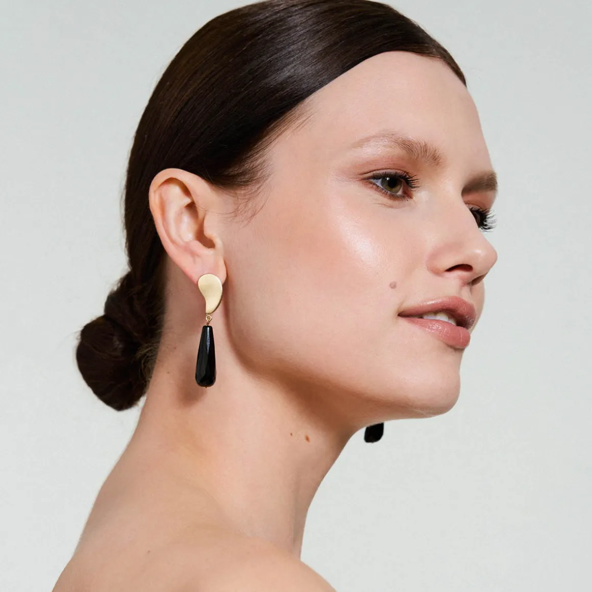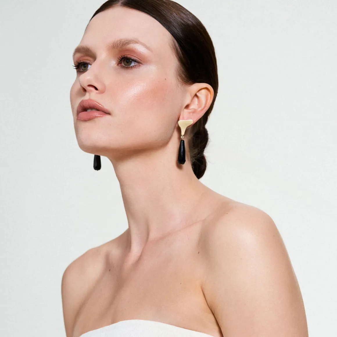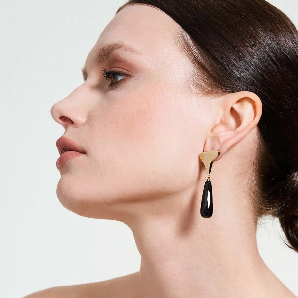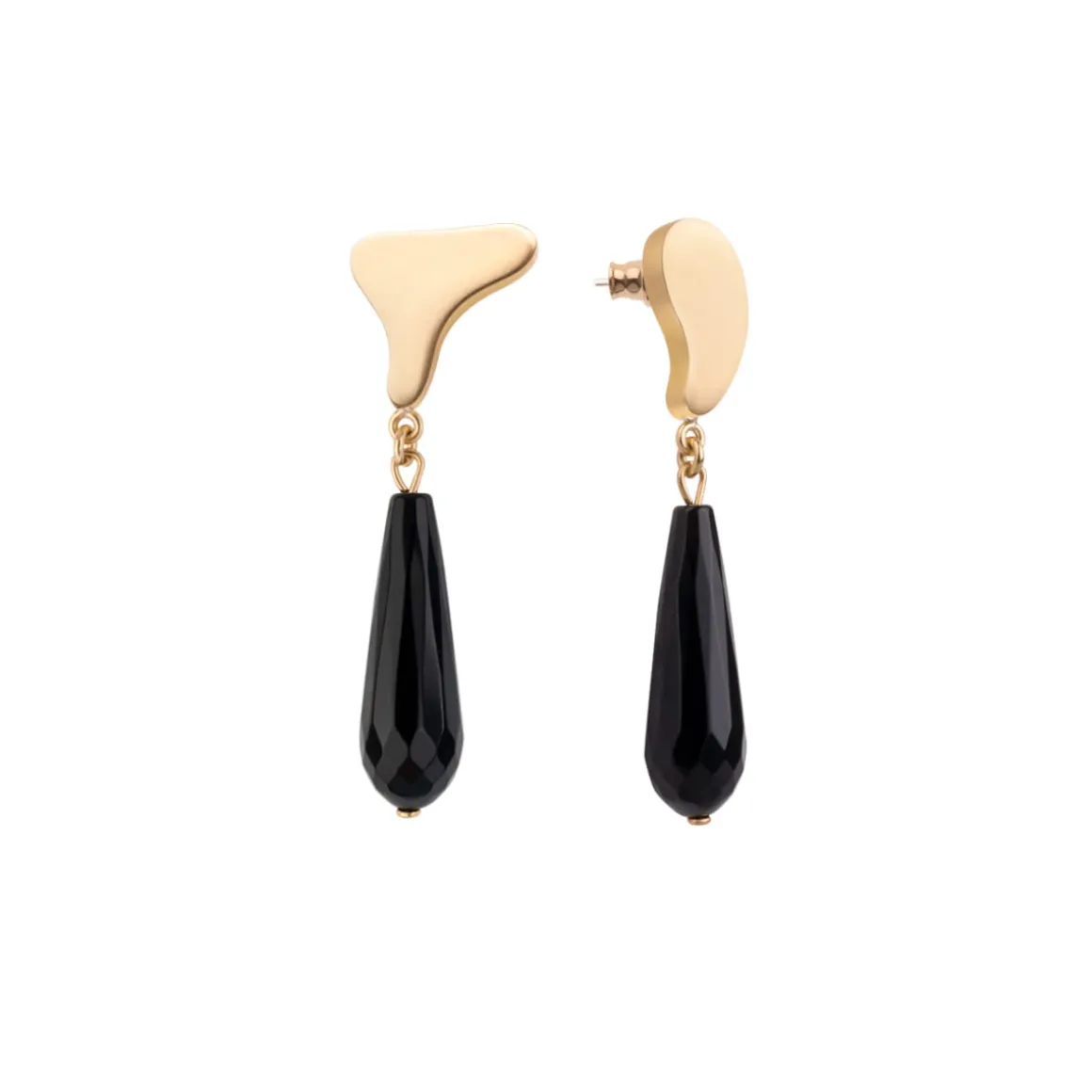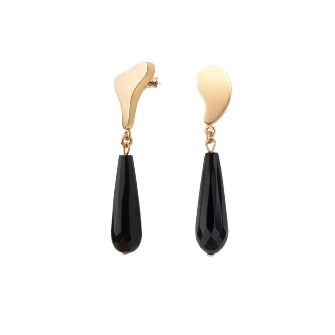 Wiszące kolczyki zostały wykonane ręcznie. Nieregularne, miękkie kształty zostały odlane w pozłacanym mosiądzu, a następnie ozdobione czarnym, fasetowanym onyksem o podłużnym kształcie. Kolczyki są asymetryczne, a ich sztyfty wykonano ze srebra. Elegancka biżuteria o minimalistycznym charakterze ozdobi każdą stylizację. Kolczyki dobrze prezentują się w towarzystwie innych wzorów z kolekcji Parer – tworzą zgrany duet z ozdobną broszką z onyksem czy artystycznym sygnetem z masą perłową.