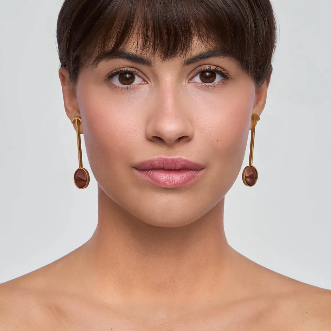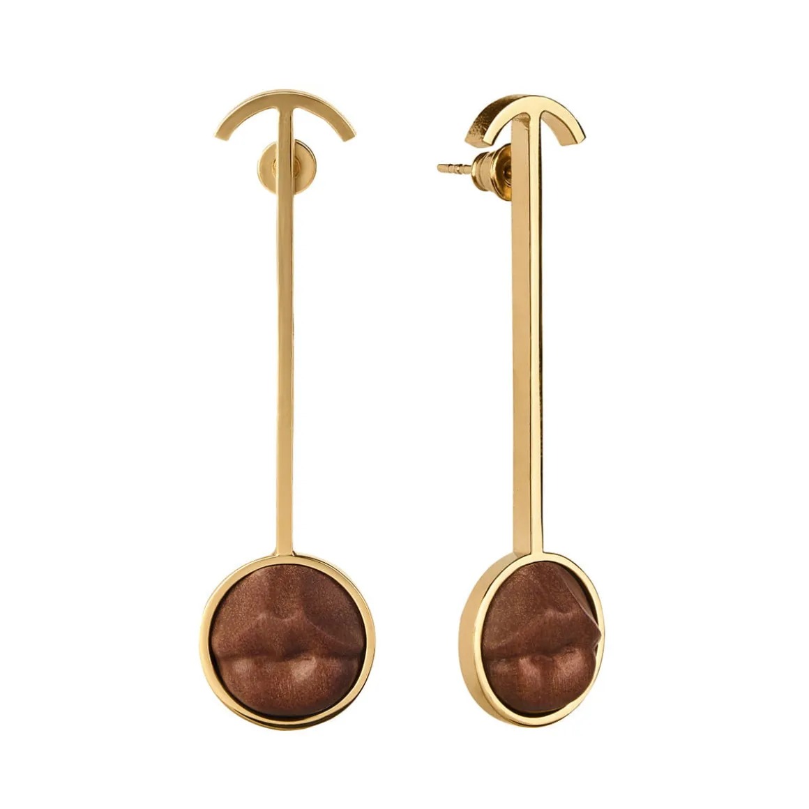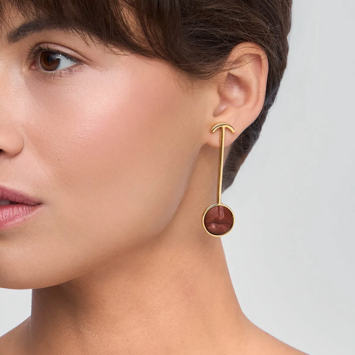 Para kolczyków przyciąga uwagę prostą geometryczną formą. Kolczyki zapinane są na sztyfty, osadzone na podłużnych elementach z pozłacanego mosiądzu. Na ich krańcach przytwierdzone zostały okrągłe formy z ustami wyrzeźbionymi w drewnie sawo – gatunku o głębokim, brązowo-czerwonym odcieniu, który pięknie współgra z pozłacaną oprawą ust. Drewno sawo, oprócz swojej ciepłej barwy, cenione jest za wytrzymałość oraz lekkość, która sprawia, że kolczyki są jednocześnie efektowne i wygodne w noszeniu na co dzień. Usta umieszczone w kolczykach przypominają realistyczne, miniaturowe rzeźby. Każdy element z drewna w tej kolekcji został ręcznie wyrzeźbiony przez balijskich mistrzów. Wykorzystane w kolczykach drewno jest materiałem naturalnym i unikatowym, więc odcienie ust w poszczególnych egzemplarzach kolczyków mogą się nieznacznie od siebie różnić, co dodatkowo podkreśla niepowtarzalny charakter biżuterii z tej kolekcji.