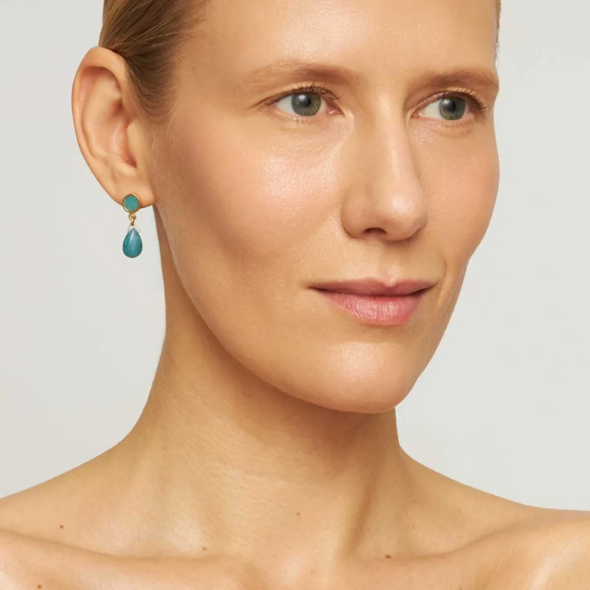 Kolczyki z kolekcji Gelato to połączenie dwóch niebieskich kamieni. Górną część przy sztyfcie zdobi oszlifowany, gładki amazonit w kolorze turkusowym, oprawiony w okrągłą ramę. Do niego przytwierdzono wiszący niebieski agat w kształcie łezki. Gładka, błyszcząca powierzchnia kamieni kontrastuje z ciepłą, pozłacaną oprawą. Kolczyki są lekkie, wygodne i zapinane na sztyft, co sprawia, że idealnie nadają się do noszenia przez cały dzień. Każda para jest niepowtarzalna – naturalne różnice kolorze kamieni sprawiają, że kolczyki mogą nieco różnić się od egzemplarza przedstawionego na zdjęciu.