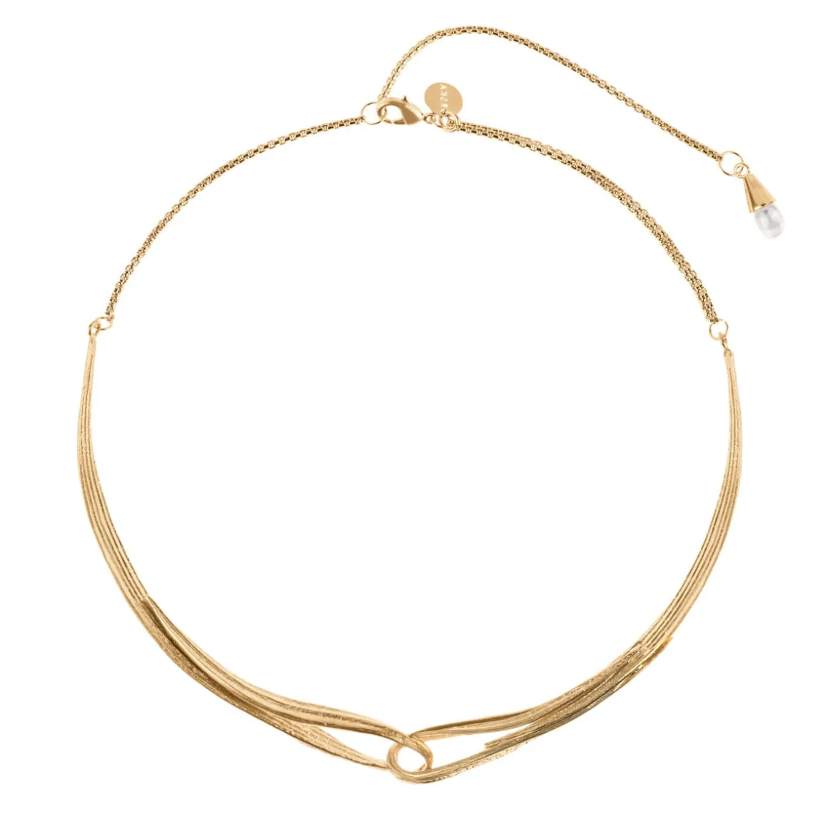 Krótki naszyjnik z kolekcji Prato wykonaliśmy ręcznie w pracowni ORSKA z pozłacanego mosiądzu. Długie źdźbła trawy, o wyraźnie odwzorowanych detalach struktury, spletliśmy razem tworząc symboliczny węzeł. Z tyłu łańcuszka dodaliśmy dodatkowy, krótki łańcuszek zakończonym transparentnym kryształem górskim w formie kropli. W biżuterii z kolekcji Prato węzeł symbolizuje naszą pierwotną więź z Ziemią. Tym samym jest nie tylko estetycznym elementem, ale i głębokim przypomnieniem o nierozerwalnym połączeniu człowieka z naturą.