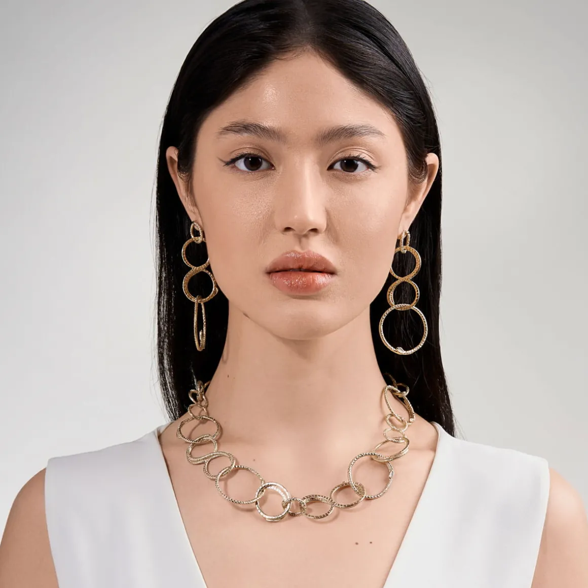 Artystyczna kolia została wykonana ręcznie w poznańskiej pracowni, jednak pomysł na nią zrodził się jeszcze w trakcie podróży Anny Orskiej na Bali. Okrągłe ogniwa o różnej wielkości odlano z mosiądzu, precyzyjnie odwzorowując motyw wężowych łusek. Po połączeniu ogniwa utworzyły krótki łańcuch. Naszyjnik pozłocono, a następnie wykończono zapięciem na artystyczny haczyk z wężowym motywem, który umożliwia wygodną i prostą regulację długości. Kompozycję uzupełnia zawieszka z głową węża oraz podwieszone logo ORSKA. Choć naszyjnik doskonale prezentuje się solo, lubi też towarzystwo pozostałych wzorów z kolekcji biżuterii Kembali – wiszące kolczyki z wężowych ogniw lub podwójny, pozłacany pierścionek utworzą wraz z nim duet, obok którego nie da się przejść obojętnie.