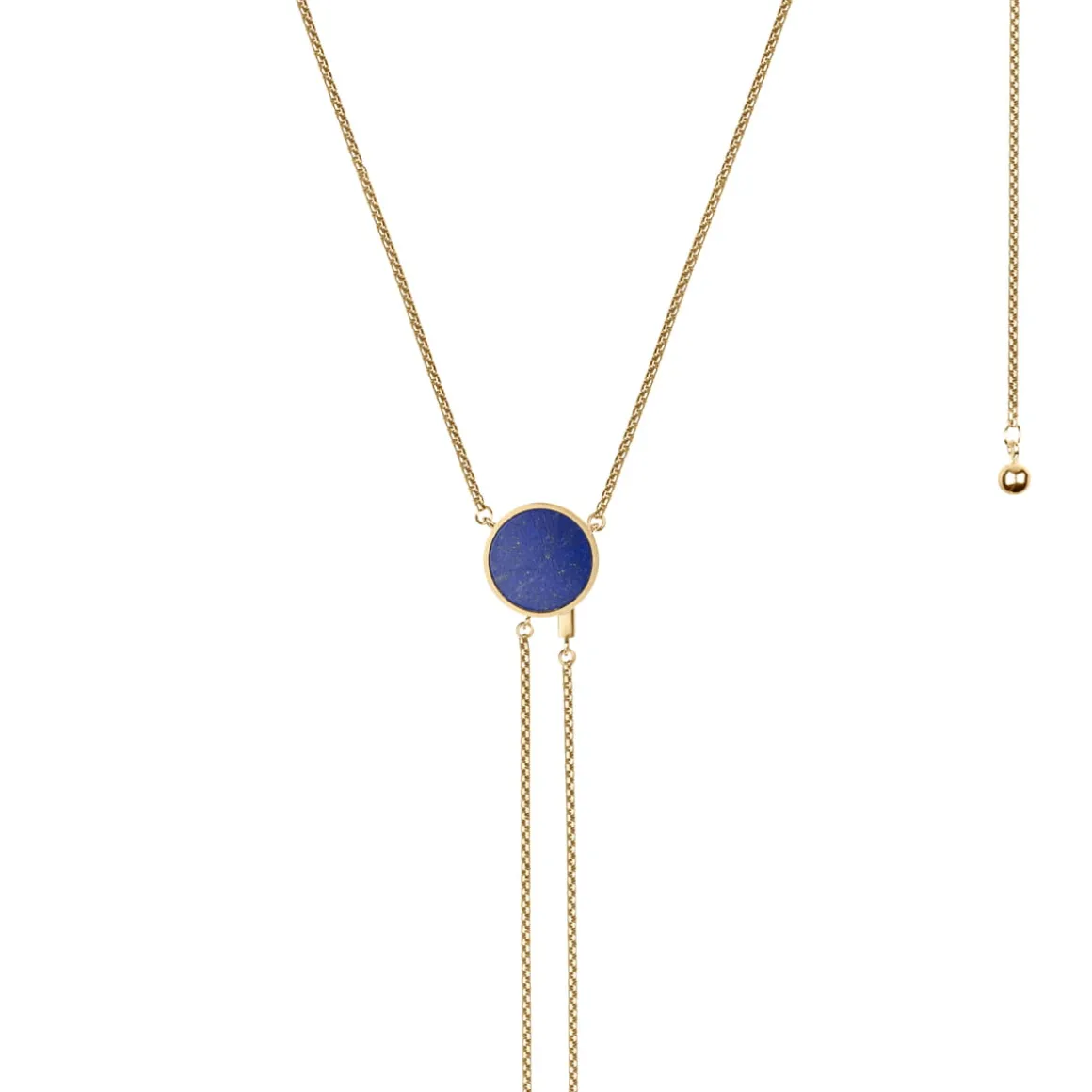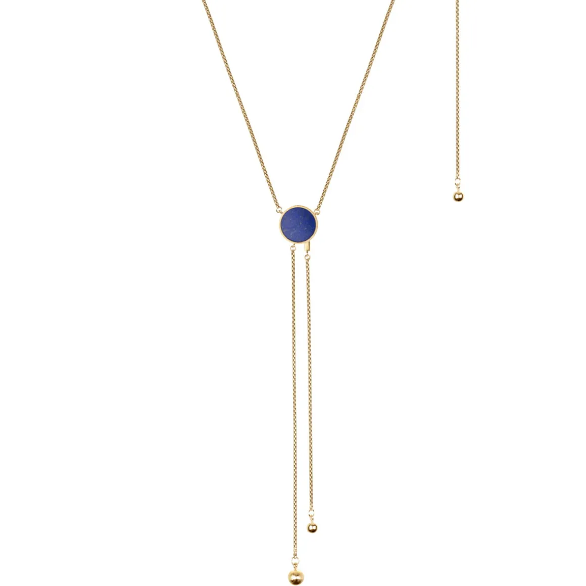 Naszyjnik Orini składa się z delikatnego łańcuszka wykonanego z pozłacanego mosiądzu, który przechodzi w elegancką zawieszkę z intensywnie niebieskiego lapis lazuli. Okrągły kamień został osadzony w minimalistycznej, złotej oprawie. Od zawieszki odchodzą dwa, łańcuszki różnej długości, zakończone niewielkimi kulami z pozłacanego srebra. Kule są asymetryczne: większa ma szczotkowaną powierzchnię, mniejsza – satynową. Ta gra struktur przyciąga spojrzenia i kradnie komplementy. Cała kompozycja swoim kształtem przewrotnie naśladuje krawat. Naszyjnik zapinany jest na karabińczyk i umożliwia zapięcie na dwóch długościach. Krawatka Orini to doskonały przykład subtelnej biżuterii, która podkreśla naturalne piękno kamienia, a jednocześnie własny oryginalny design.
