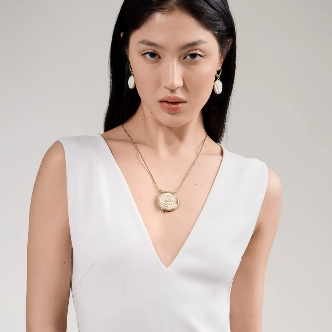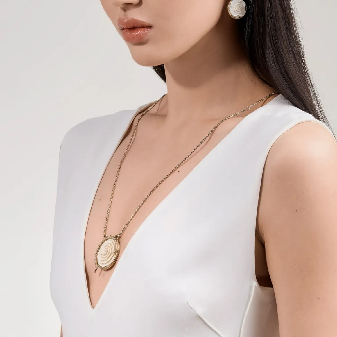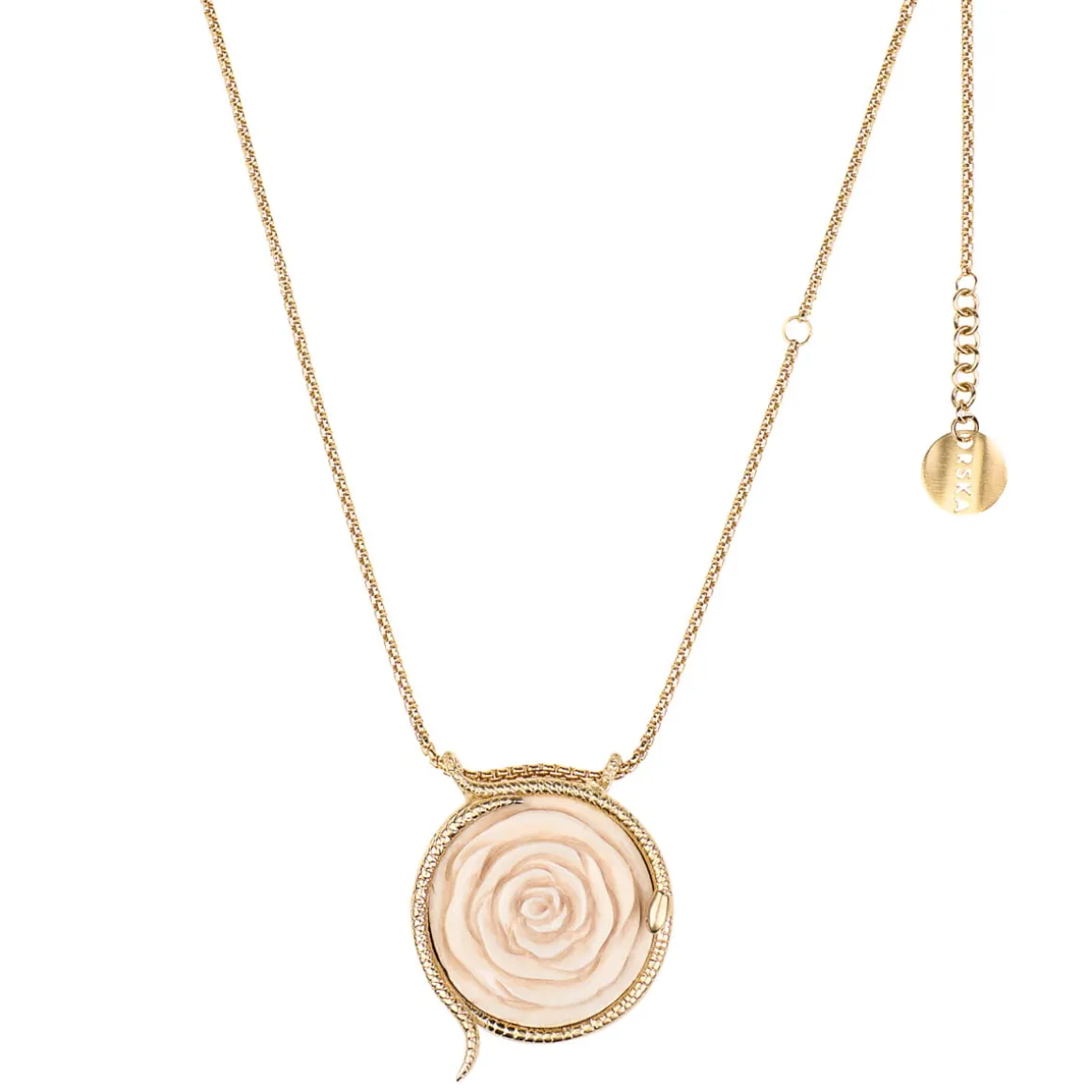 Naszyjnik został wykonany ręcznie. Balijscy rzeźbiarze stworzyli białą różę, która wprost z rajskiej wyspy trafiła do pracowni ORSKA. Mała rzeźba oprawiona została w ramę wykonaną z pozłoconego mosiądzu z wiernie odwzorowanym wężowym motywem. Rewers oryginalnego medaliony również ozdobiono grawerem wężowej skóry, a następnie powieszono go na łańcuszku o splocie kostki. Naszyjnik wykończono zawieszką z logo ORSKA, blaszką z wygrawerowanym napisem „Limited Edition” oraz wygodnym zapięciem na karabińczyk. Ogniwa umożliwiają zapięcie naszyjnika na trzech wysokościach. Naszyjnik z różaną zawieszką doda lekkości wieczornym stylizacjom, a te codzienne, zyskają dzięki niemu odrobinę blasku i fantazji. Róża, poza swoją niewątpliwą urodą, jest też ogólnoświatowym symbolem miłości i oddania. Biżuteria z tym motywem będzie pełnym znaczenia uzupełnieniem ślubnych kreacji oraz symbolicznym podarunkiem dla ukochanych.