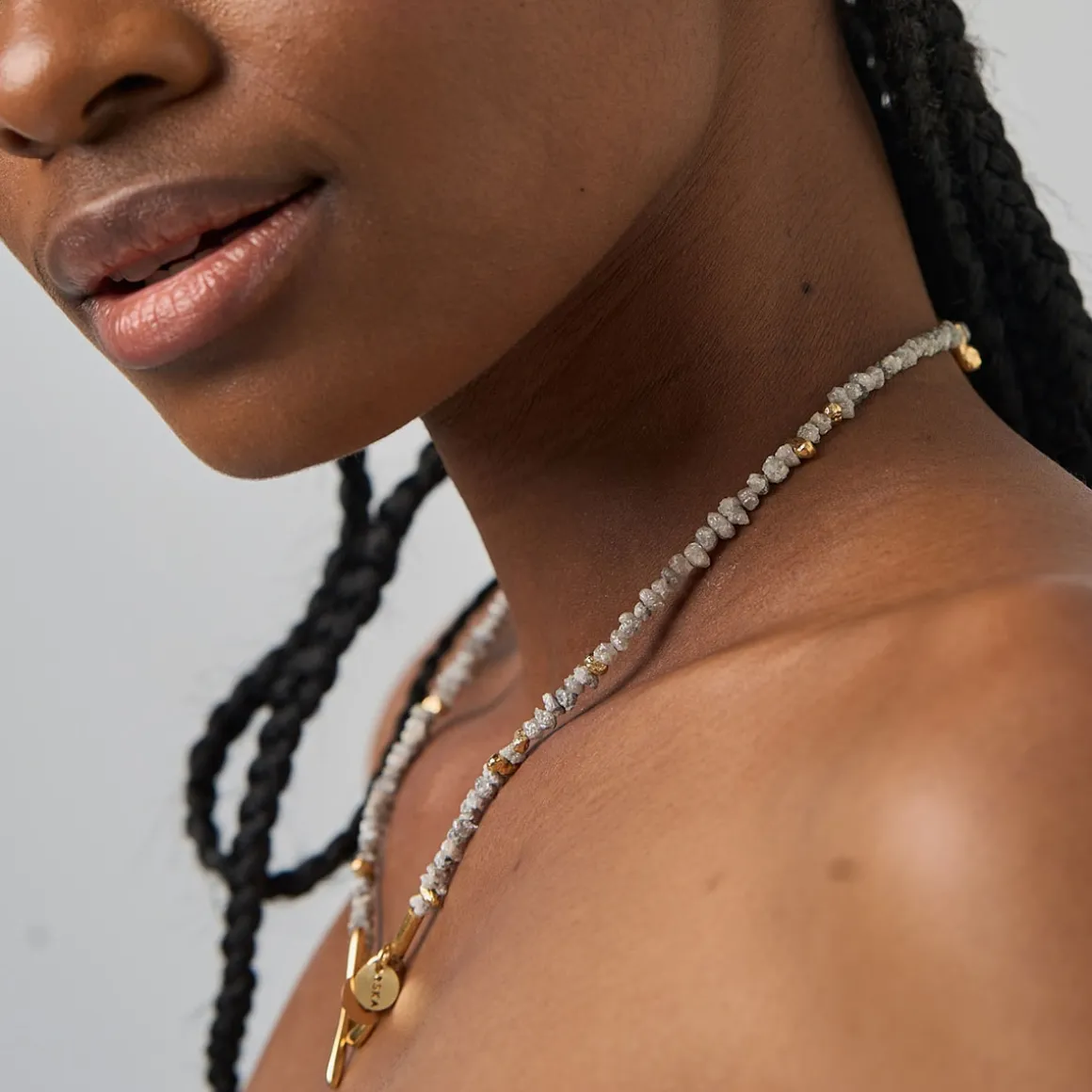 Diamentowy naszyjnik został wykonany ręcznie. Sznur nieoszlifowanych, nieregularnych bryłek diamentów przepleciono bryłkami pozłacanego srebra próby 925. Każdy z kamieni ma unikatowy kształt i barwę. Surowe diamenty przywodzą na myśl iskrzące w słońcu sople lodu. Oryginalnie skontrastowano je z ciepłym, złotym kolorem. Kompozycję artystycznego naszyjnika zamyka blaszka Limited Edition i logo ORSKA. Naszyjnik dodatkowo zdobi zapięcie toggle, które jednocześnie pełni funkcję zawieszki. Toggle składa się z dwóch elementów: pałeczki i okręgu. Mechanizm zapinania jest prosty i polega na przełożeniu pałeczki przez obręcz. Efektowny naszyjnik z diamentami sprawdzi się zarówno w codziennych, jak i wieczorowych sytuacjach. Stylizację może uzupełnić diamentowa bransoletka lub drobne kolczyki na sztyft z nieoszlifowanymi diamentami. Razem stworzą kompozycję, która nie umknie żadnemu spojrzeniu.