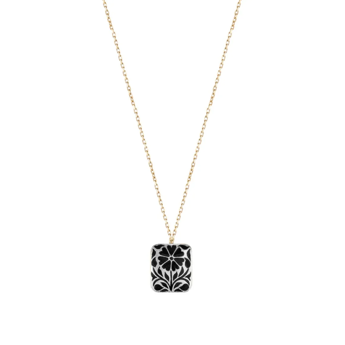 Naszyjnik na delikatnym łańcuszku wykonano z pozłacanego srebra. Jego centralnym elementem jest dwustronna zawieszka, bogato zdobiona mineralną emalią. Z jednej strony przedstawia czarny kwiat nagietka na srebrnym tle, tworząc elegancką, stonowaną kompozycję. Na odwrocie znajduje się intensywnie niebieski kwiat klitorii, otoczony zieloną emalią, który nadaje całości wyrazistego, świeżego charakteru. Dekoracyjne ornamenty zdobią również brzegi zawieszki – na pozłacanej powierzchni namalowano czarne pnącza, oplatające formę niczym symbol trwałych, nieprzemijających więzi.