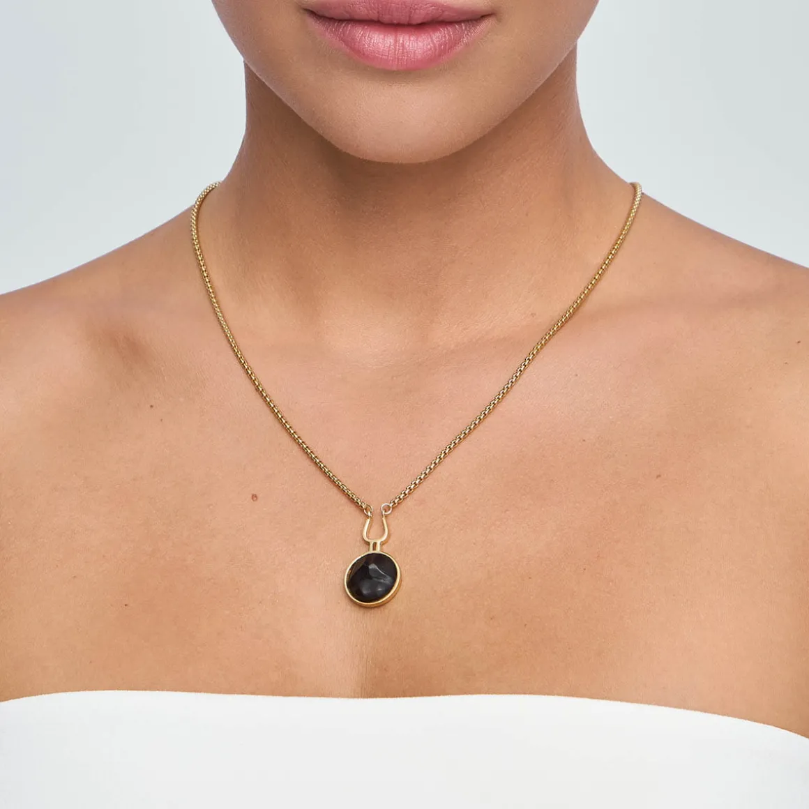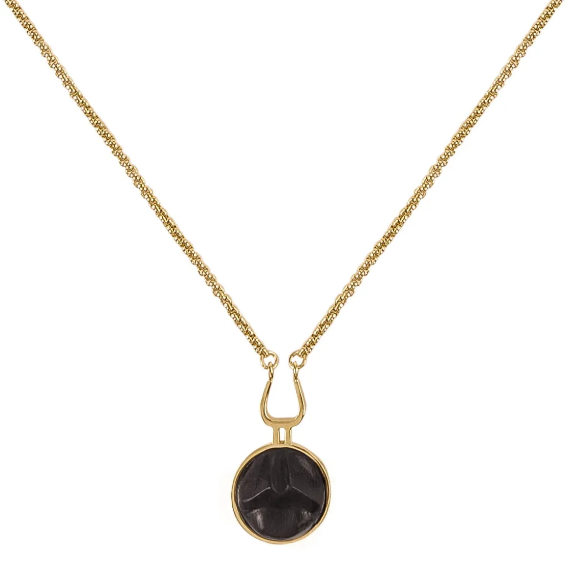 W naszyjniku uwagę przyciąga zawieszka w kształcie koła wykonana z ciemnego, lśniącego drewna arang, pochodzącego z balijskich lasów. To materiał wybierany przez lokalnych rzemieślników od pokoleń, nie tylko ze względu na trwałość i strukturę, która pozwala na precyzyjne rzeźbienie detali, ale również z powodu jego szlachetnej niemalże czarnej barwy. Z tego drewna balijscy mistrzowie wyrzeźbili usta, które w pracowni ORSKA oprawiliśmy w kształt okrągłego wisiorka. Naszyjnik dopełnia łańcuszek zakończony przedłużką, która umożliwia regulację długości. Całość została wykonana z mosiądzu pozłacanego, którego blask zadziornie kontrastuje z ciemnym drewnem.