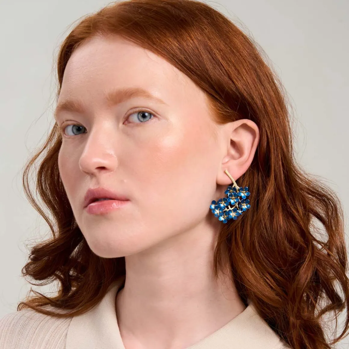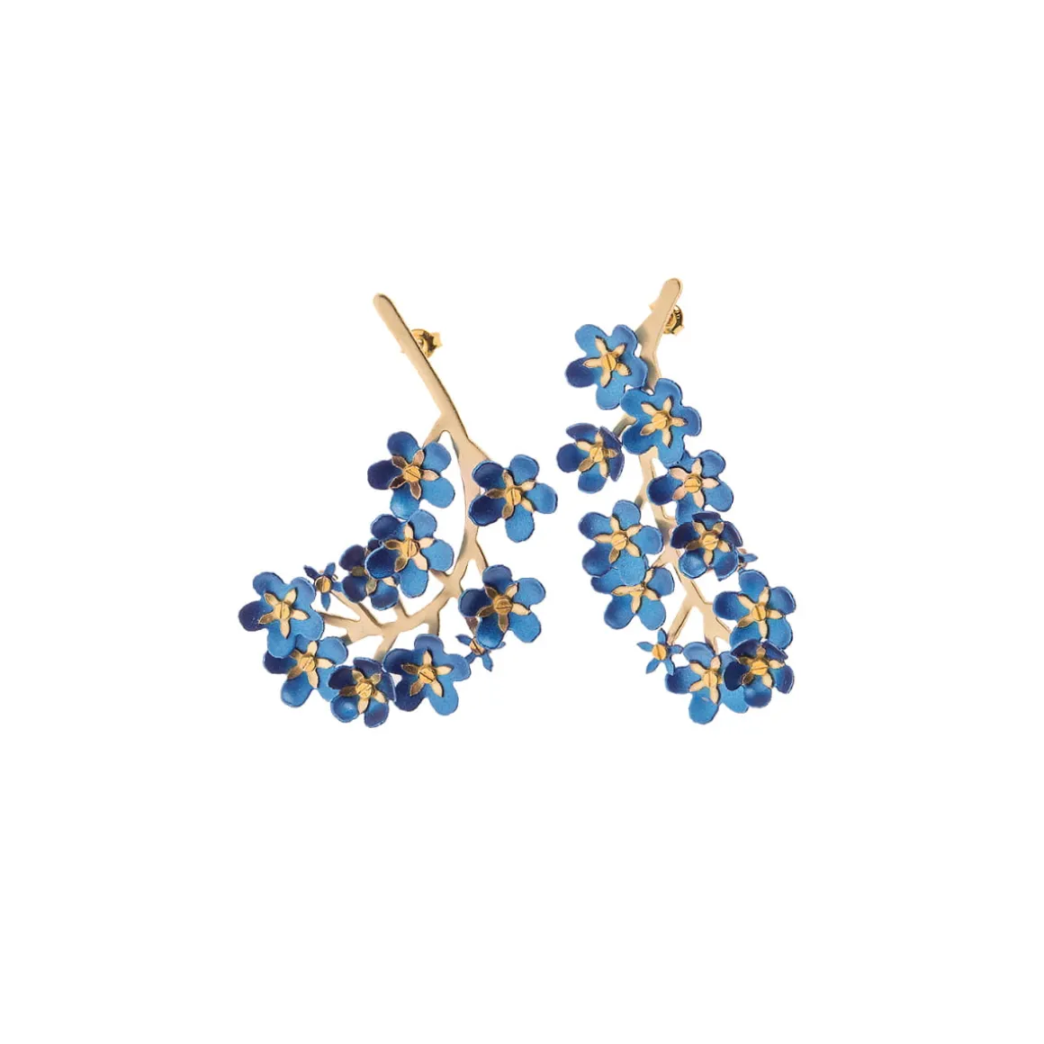 Asymetryczne, wiszące kolczyki zostały ręcznie wykonane z pozłacanego mosiądzu. Złotą łodygę ozdobiono pękiem drobnych, błękitnych, ręcznie malowanych niezapominajek, które powstały z pomocą zegarmistrzowskich śrubek. Urocze kwiaty przekazują niemą prośbę o pamięć i noszenie w sercu osoby obdarowującej. Dzięki temu są znaczącym prezentem zarówno dla przyjaciół, rodziny jak i ukochanych. Efektowne i eleganckie przyciągają uwagę. Dzięki oryginalnemu, organicznemu designowi dodadzą dziewczęcego uroku i wiosennej świeżości każdej stylizacji.