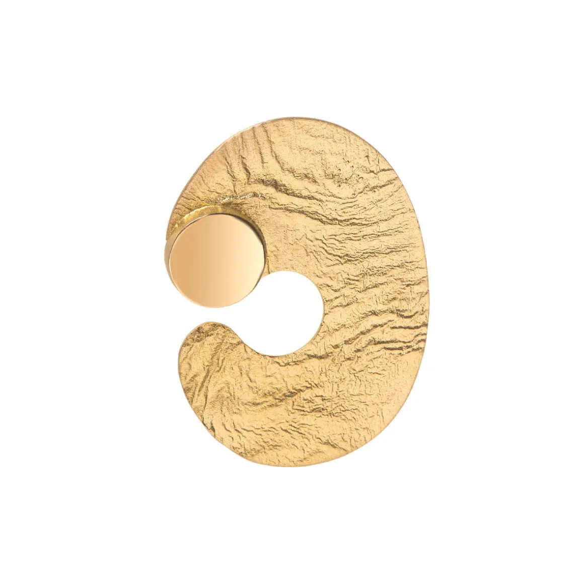 Urzeczona tajemniczością Księżyca, Anna Orska zaprojektowała kolekcję MOON, której charakterystyczna, falista struktura powstaje w wyniku podgrzewania palnikiem powierzchni metalu. Unikatowa biżuteria powstaje dzięki nieprzewidywalnym efektom tego zabiegu. Ręcznie robiony pin w artystyczny sposób łączy przeciwności: powierzchnię pofałdowaną z gładzią wypolerowaną na wysoki połysk, odcienie chłodnego grafitu i ciepłego złota. Finezyjny kształt połączony zostały z geometryczną perfekcją okręgu, który w symboliczny sposób oddaje różnorodność faz srebrnego globu.