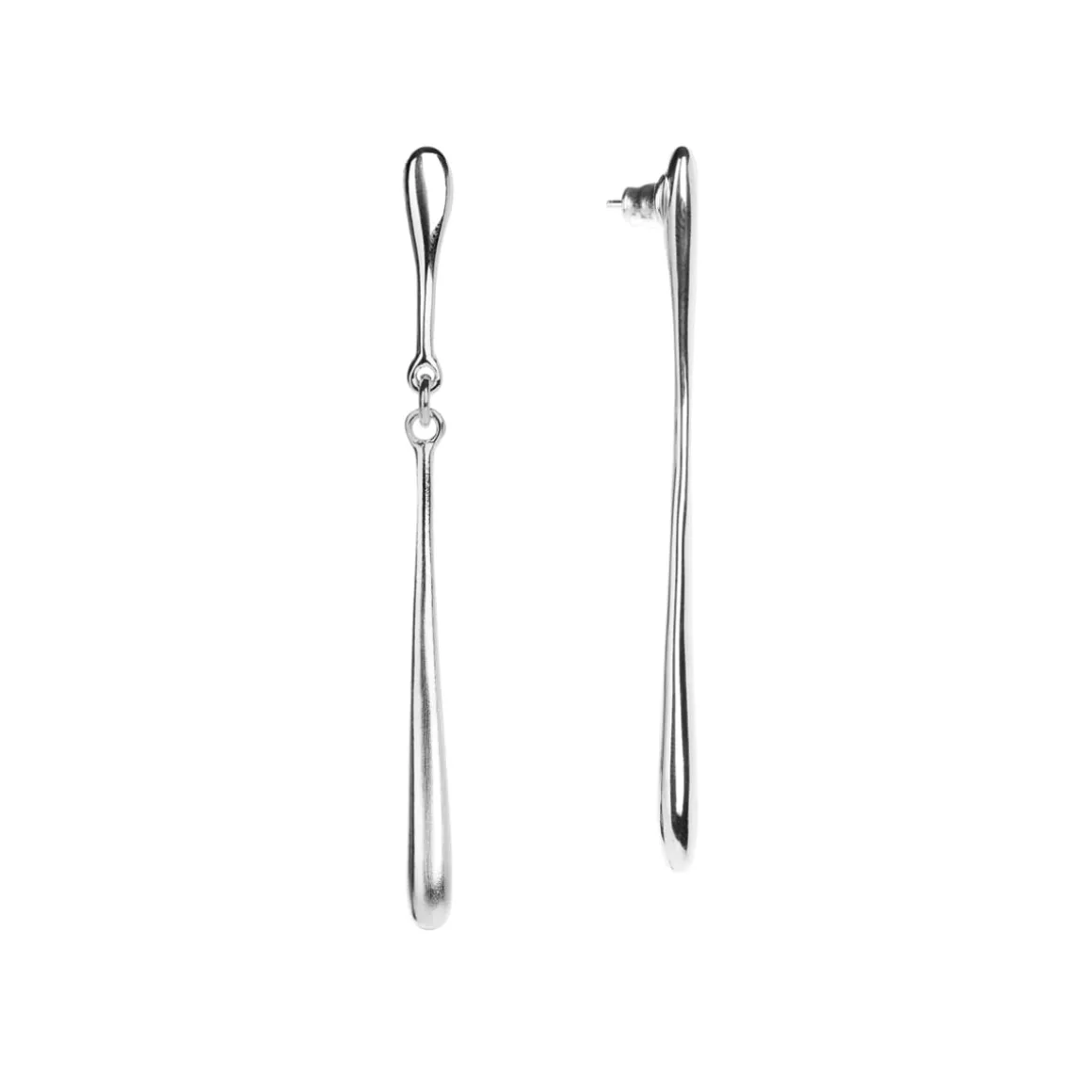 Asymetryczna para kolczyków wygląda jakby została wykonana z podłużnych kropli płynnego metalu. Pierwszy, dłuższy z pary, został stworzony z dwóch połączonych ze sobą elementów w kształcie łezek. Drugi jest krótszy i złożony z jednego, długiego elementu. Kolczyki zostały stworzone z jasnego srebra o wysokim połysku, które pasuje do wszystkich typów urody, a w formie długich kolczyków rozświetla twarz. Srebrne kolczyki są uniwersalne i ponadczasowe, ale lubią też kreatywne połączenia. Zestaw je ze złotym naszyjnikiem lub bransoletką i uwierz w siłę kontrastów!