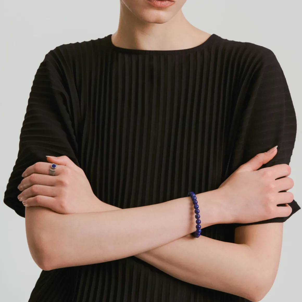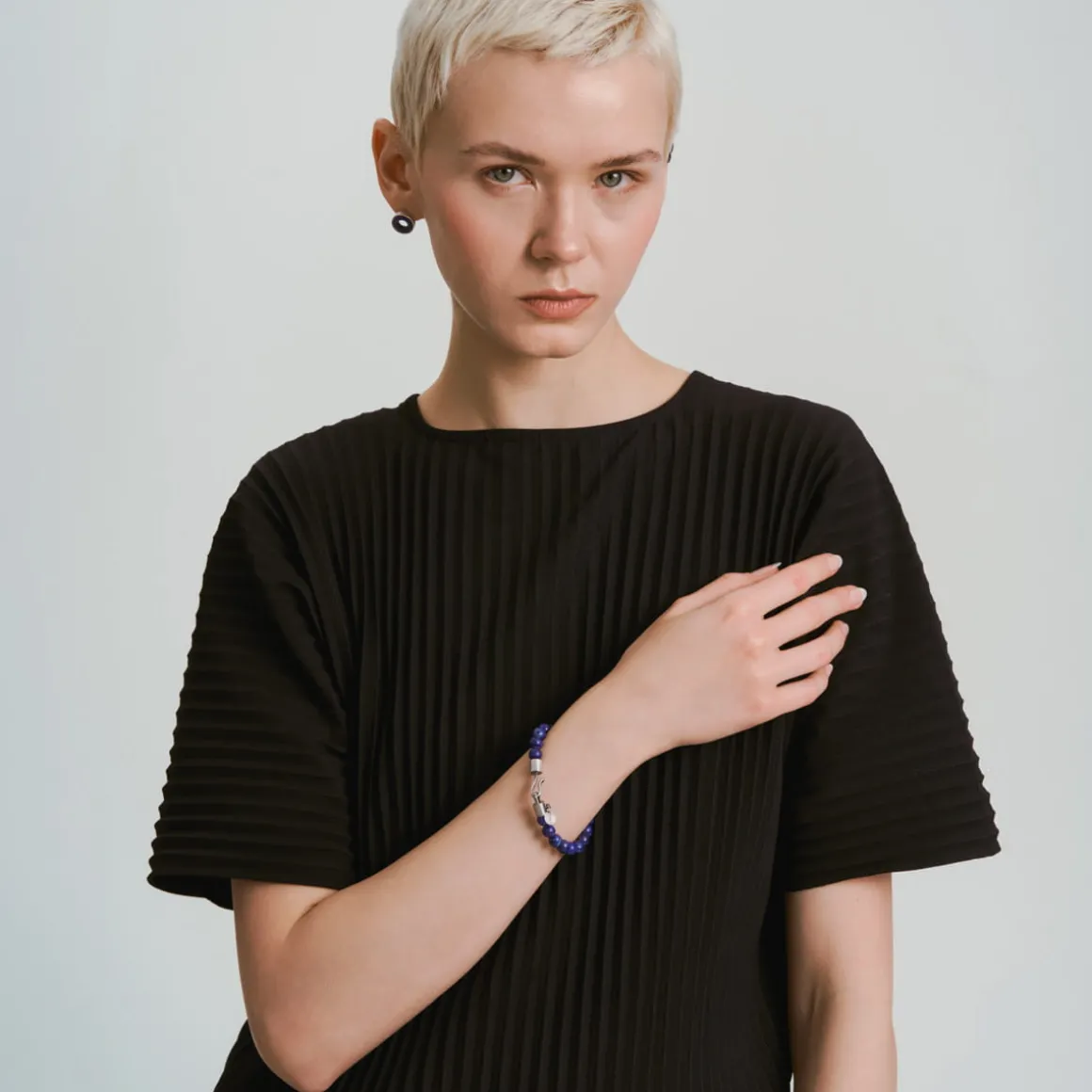 Bransoletka Orini została wykonana ręcznie z matowych, głęboko niebieskich korali lapis lazuli, które współgrają z okuciem z oksydowanego srebra w grafitowym kolorze. Delikatne zapięcie o finezyjnym kształcie ozdobiliśmy niewielkim logo ORSKA. Zapięcie jest także wygodne i praktyczne – ułatwia zapinanie bransoletki jedną ręką. Bransoletka dostępna jest także w złotym kolorze – możesz nosić je razem tworząc ciekawsze, bardziej urozmaicone stylizacje. Bransoletka odnajdzie się w towarzystwie srebrnej obrączki z oczkiem oraz oryginalnego pinu z tej samej kolekcji, tworząc charakterną kompozycję na co dzień i na wyjątkowe okazje.