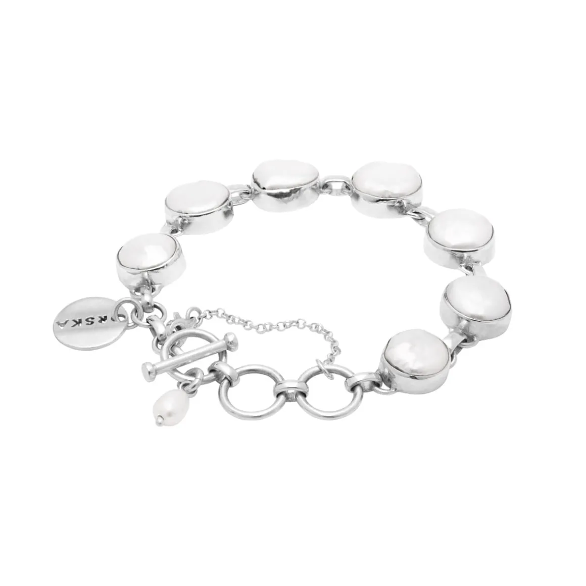 Okrągłe perły o nieregularnej powierzchni zostały otulone srebrnymi ramami próby 925 i połączone w efektowny perłowy sznur. Każda perła ma charakterystyczne wypukłości i załamania powierzchni, które sprawiają, że kamienie mienią się przy każdym ruchu. Bransoletka zakończona została dużymi srebrnymi ogniwami i zapięciem na ozdobny skobel, który nadaje całej kompozycji wyrazisty, odważny charakter. Do zapięcia przymocowano zawieszkę z wiszącą perłą, która subtelnie kołysze się przy każdym ruchu nadgarstka. Dodatkowo bransoletka posiada łańcuszek zabezpieczający przed przypadkowym odpięciem się biżuterii. Bransoletka wykończona została logiem ORSKA.