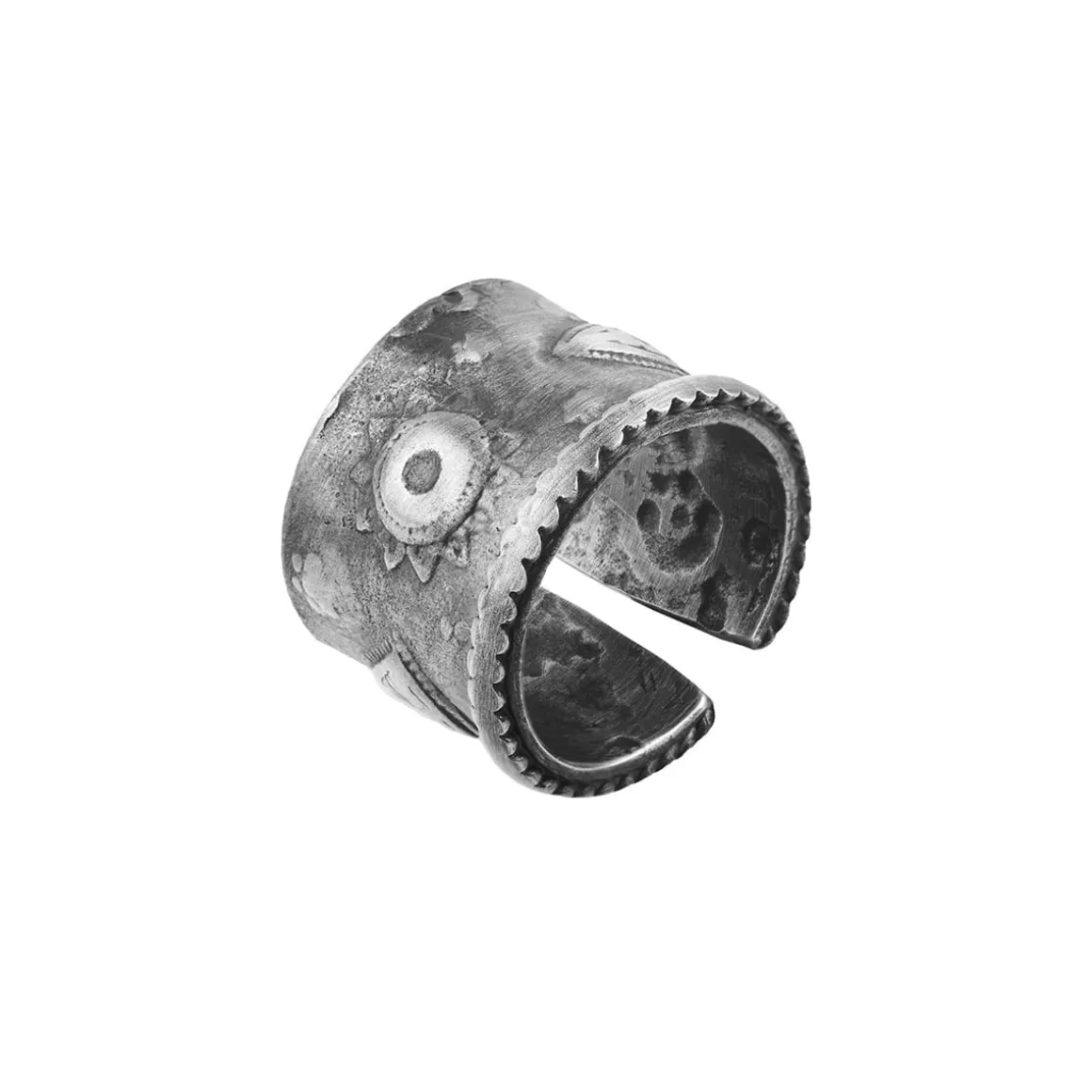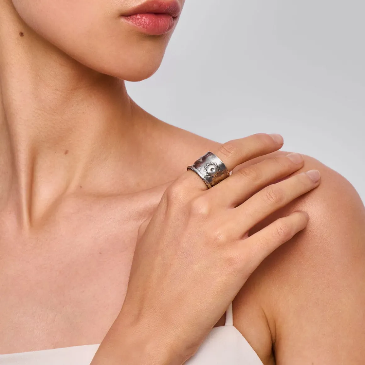 Szeroki pierścionek wykonaliśmy ręcznie w pracowni jubilerskiej ORSKA z oksydowanego srebra próby 925. Obrączka ma ciemny, grafitowy kolor, który przyciąga uwagę i podkreśla ozdobne ornamenty, zdobiące jego powierzchnię nieprzypadkowo. W kulturach świata ornamenty pojawiały się na świątyniach, tkaninach, naczyniach, broni i biżuterii – nie tylko po to, by cieszyć oko, ale także by chronić, opowiadać, przypominać. Każdy motyw – spiralny, roślinny, geometryczny – niósł znaczenie. Spiralne linie symbolizowały życie i odrodzenie, roślinne wzory – płodność i harmonię z naturą, a powtarzalne formy geometryczne – porządek, wieczność, duchową równowagę. Charakterystyczne zdobienia, nierównomierna faktura oraz ozdobne wykończenia krawędzi nadają szerokiej obrączce z kolekcji Semios wyrazisty, nieco surowy charakter.