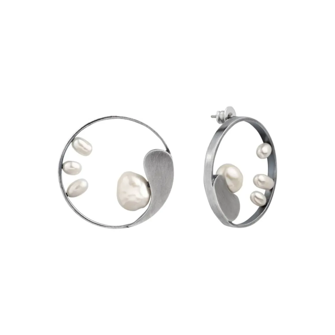 Asymetryczne kolczyki zostały wykonane ręcznie. W klasyczne koła wpisano miękkie, nieregularne kształty odlane w srebrze, które ozdobione zostały perłami słodkowodnymi. Całość utworzyła elegancką kompozycję, przypominającą zdobne ornamenty art nouveau. Kolczyki, mimo dekoracyjnej formy, mają elegancki charakter. Pięknie prezentują się solo, ale lubią być w komplecie! Docenią towarzystwo naszyjnika z dużymi perłami i czarno-białej bransoletki z onyksem.
