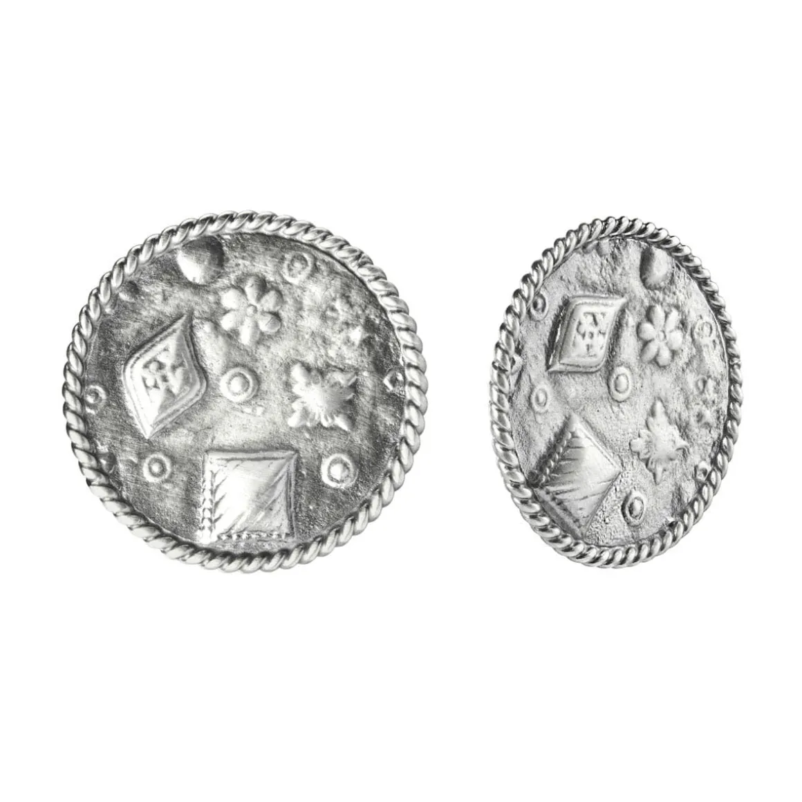 Srebrne kolczyki zostały wykonane ręcznie ze srebra próby 925. Kolczyki przyciągają wzrok bogactwem detali. Geometryczne i roślinne ornamenty na powierzchni biżuterii przypominają wzory z dawnych monet, pieczęci i medalionów. Oksydowane srebro podkreśla surową fakturę, dodając ozdobnym tłoczeniom głębi i charakteru. Kolczyki na brzegach zakończone są ozdobną ramą plecionego warkocza. Dzięki zapięciu na sztyft są nie tylko efektowne, ale i komfortowe w noszeniu, sprawdzą się więc zarówno na co dzień, jak i na specjalne okazje.